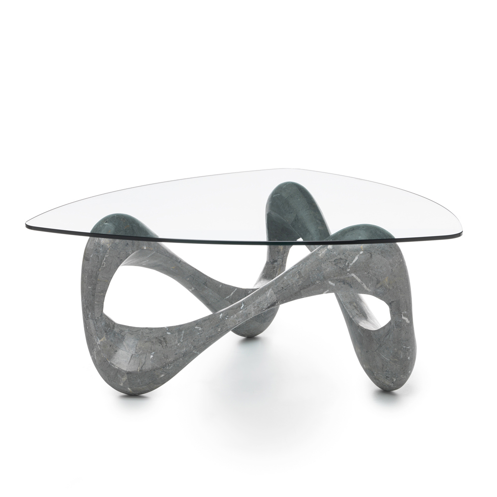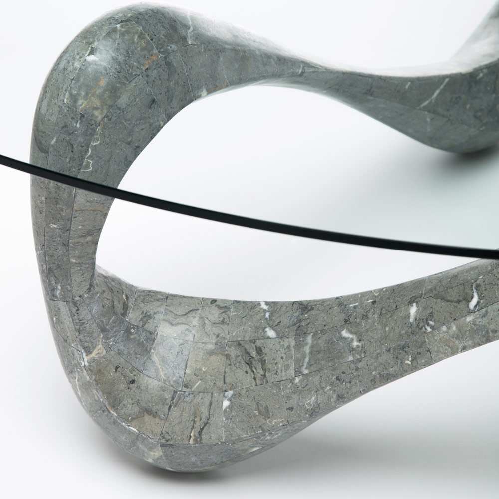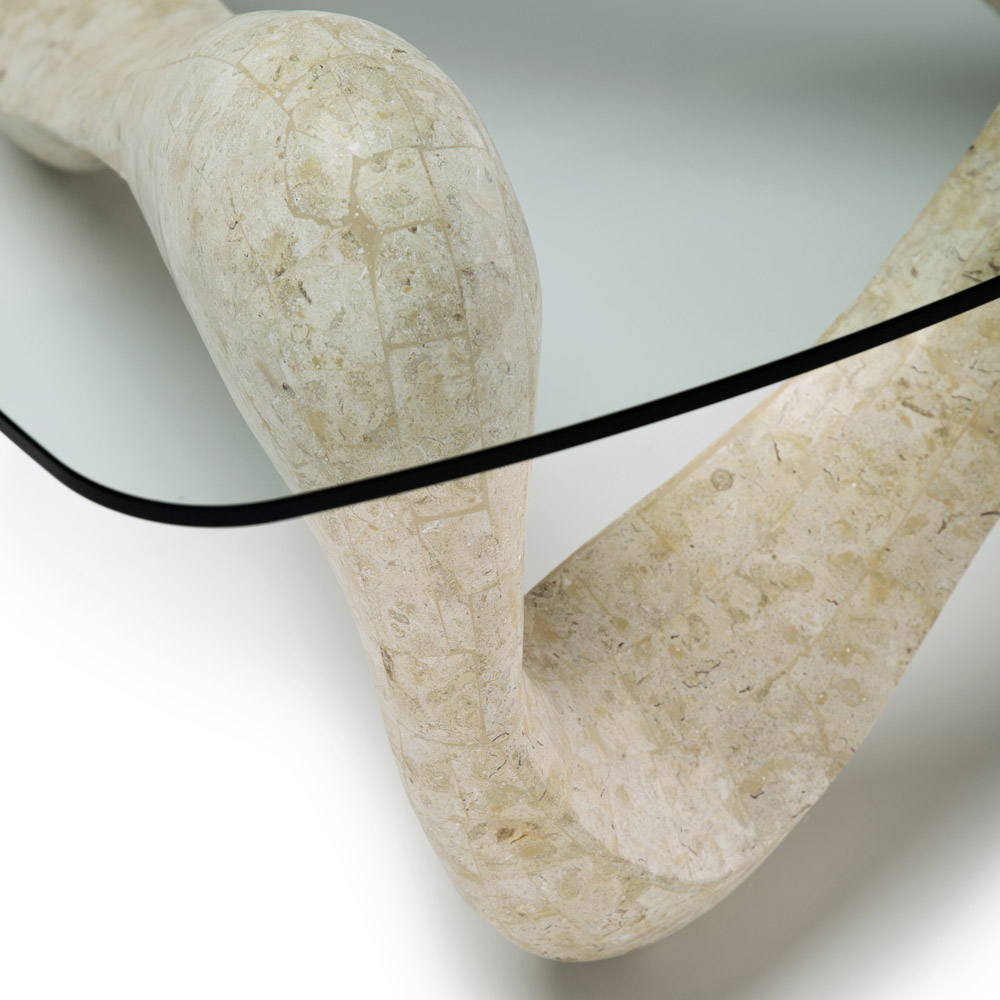 A mesa de centro Califórnia mostra a habilidade de artesãos especializados no trabalho da pedrafóssil , de forma a dar-lhe as formas mais díspares.