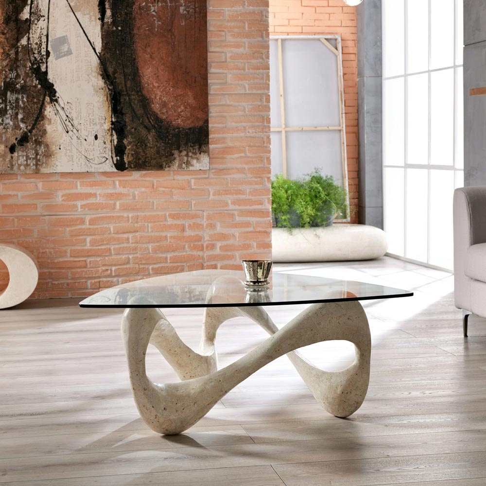 Mesa de centro em pedra fóssil com tampo em vidro.