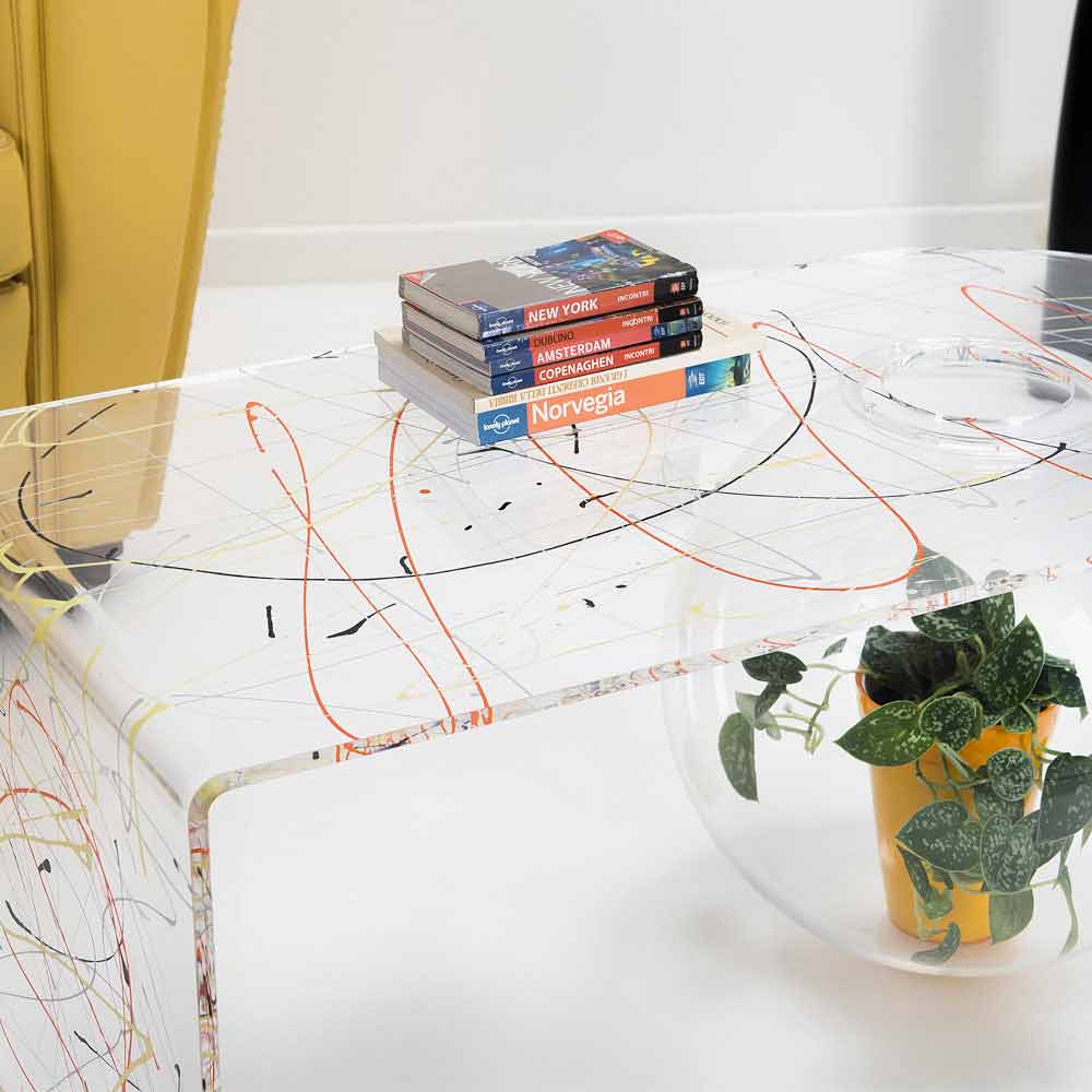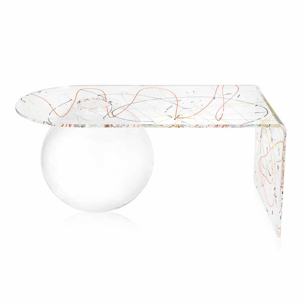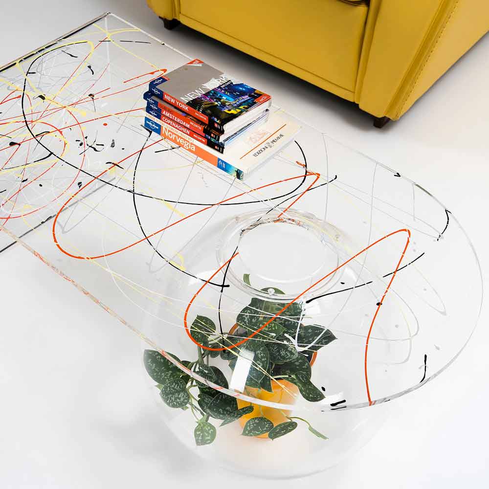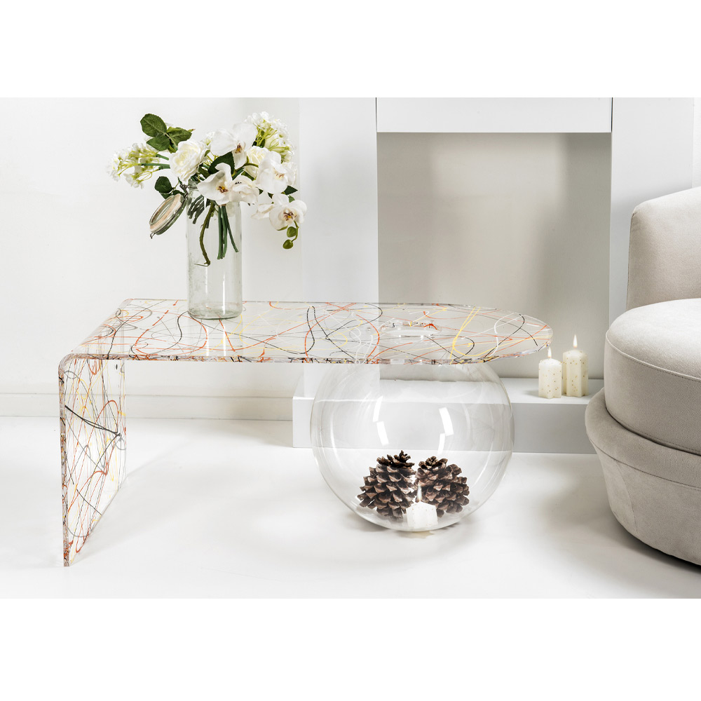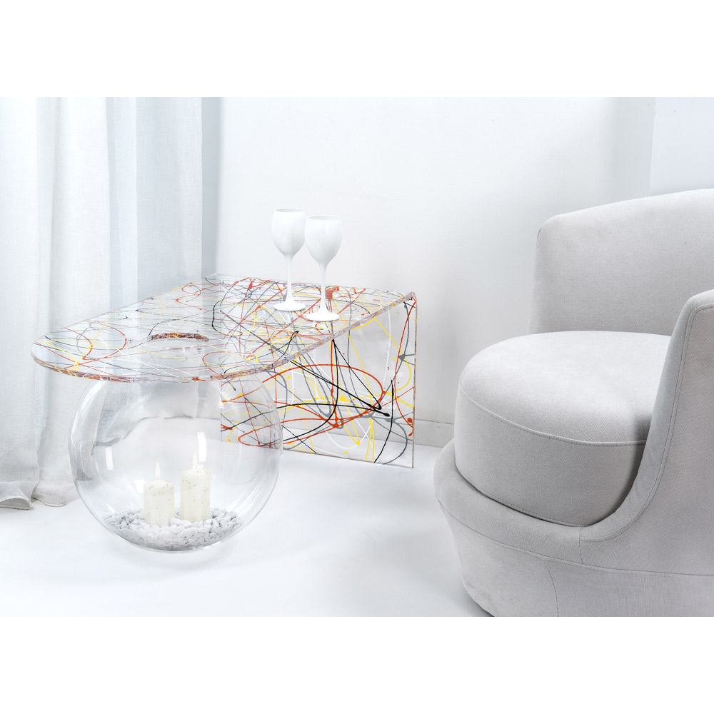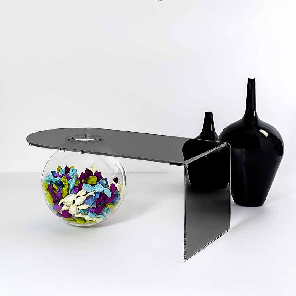 Bolly sala de estar mesa de café plexiglass, made in Italy Bolly é uma mesa curva fabricada na Itália em polímero virgem 100% PMMA, cortada a laser, termoformada a altas temperaturas e montada em uma estrutura esférica que pode ser usada como vaso de flores, aquário ou simplesmente como recipiente.