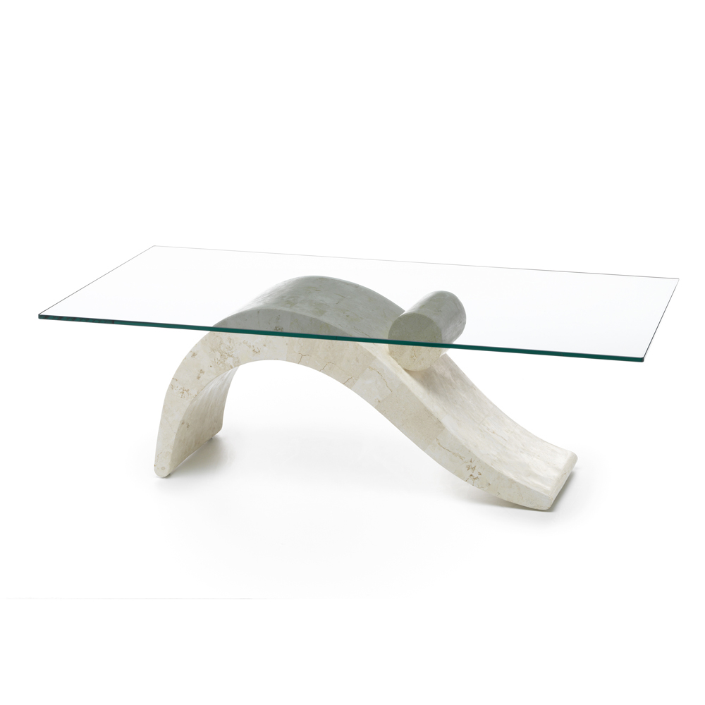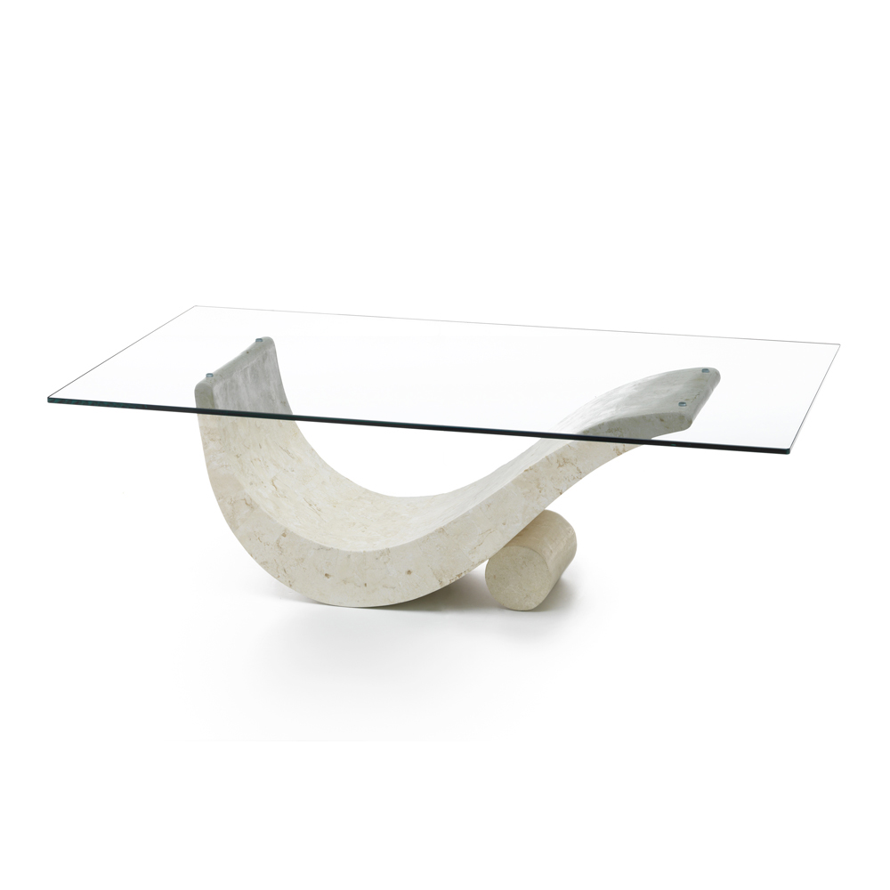 Possui estrutura em pedra fóssil com acabamento em ágata branca e tampo em vidro transparente temperado polido de 10mm.