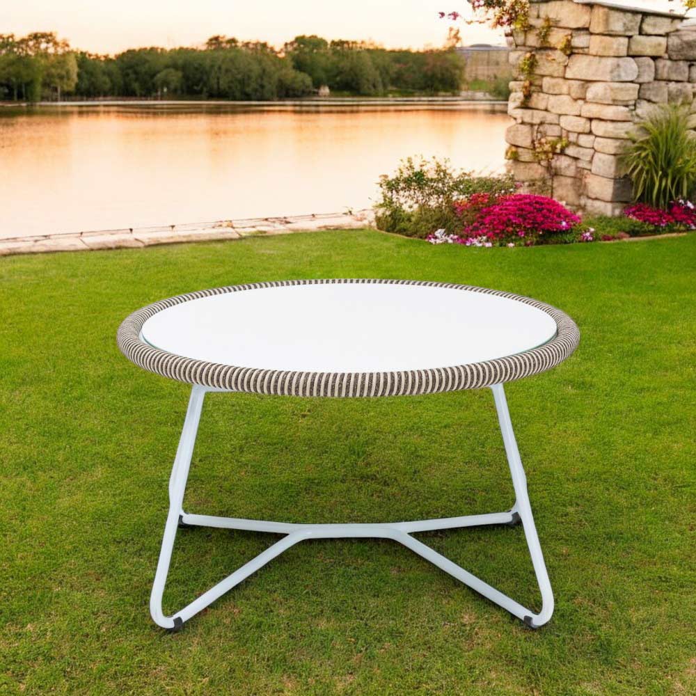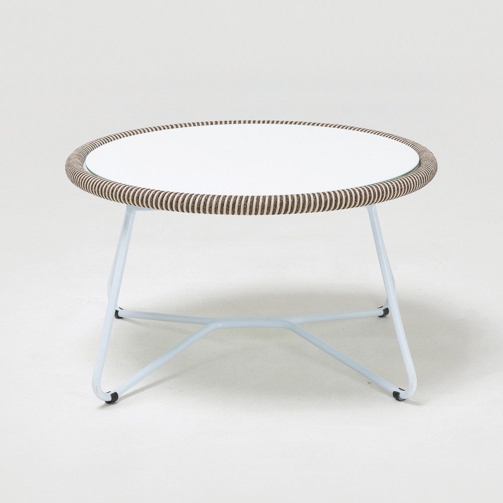 Esta mesa de jardim é o epítome do design que encontra a funcionalidade na sua forma mais pura e estilisticamente refinada. O tampo redondo é habilmente tecido, criando um efeito visual sugestivo que atrai o olhar e convida ao toque. A base em alumínio pintado confere à mesa uma leveza quase etérea, ao mesmo tempo que garante estabilidade e resistência às condições exteriores.