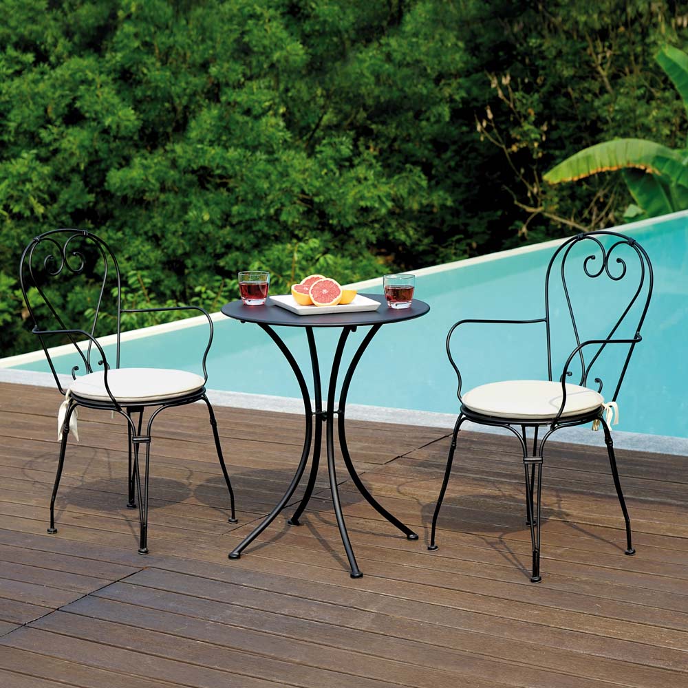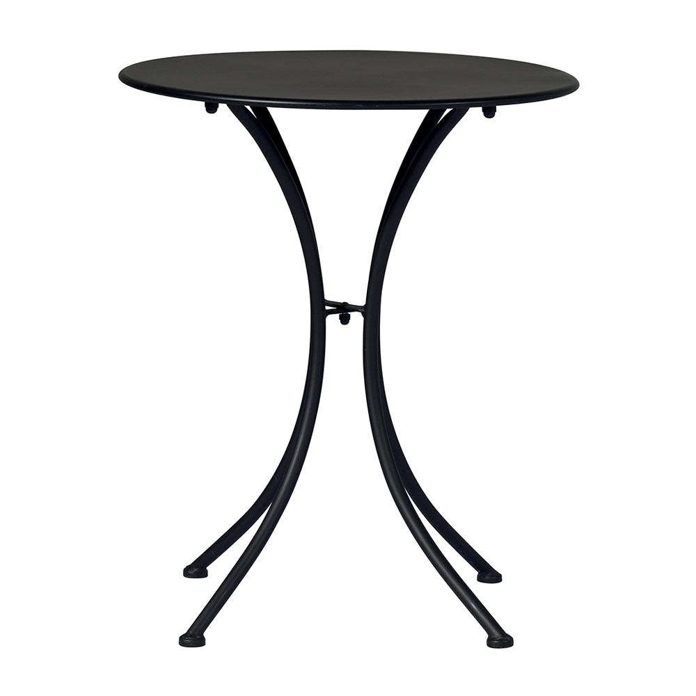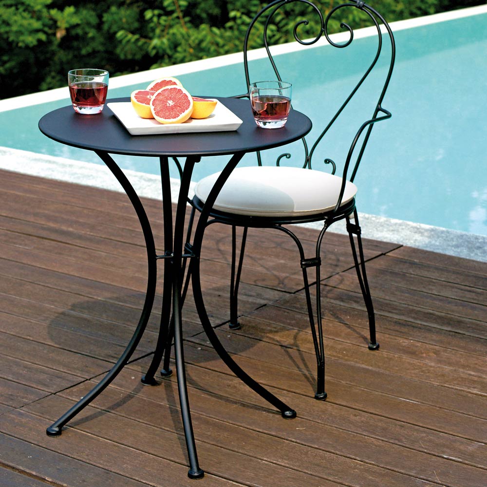 Mesa de jardim redonda feita inteiramente de ferro pintado de preto com tratamento antiferrugem .Uma peça de mobiliário cuja estética é marcada por volumes equilibrados e formas claras que lhe permitem fornecer qualquer contexto exterior, tanto doméstico como contratual, com elegância moderna.