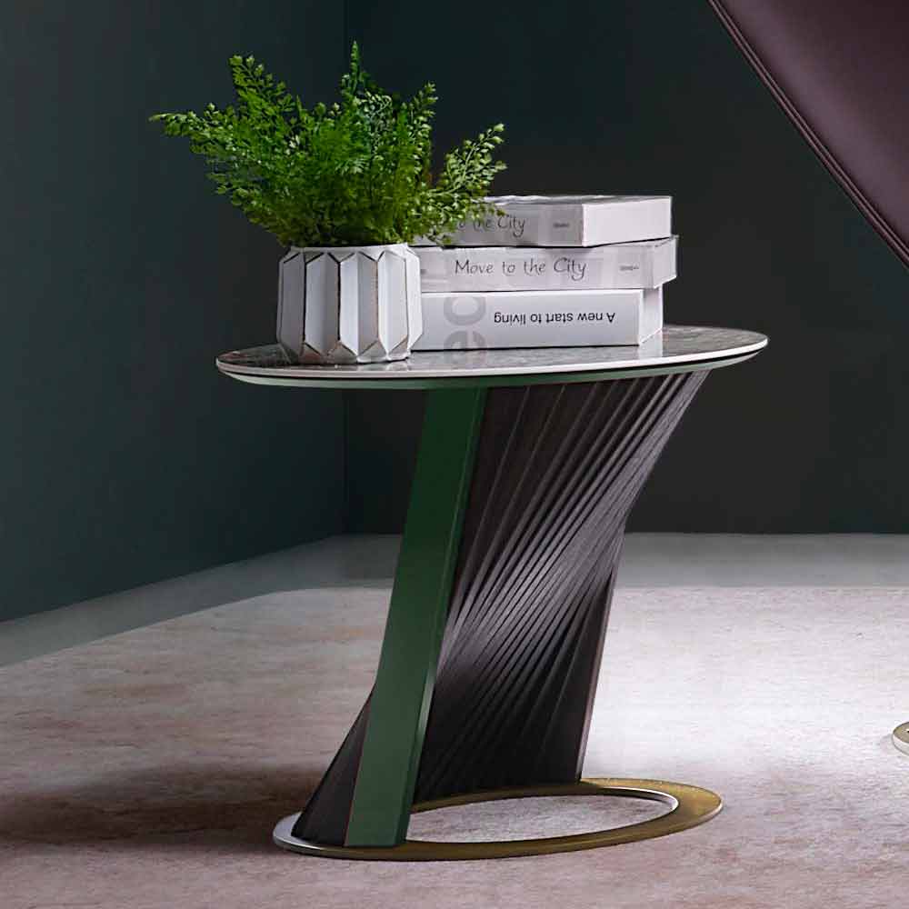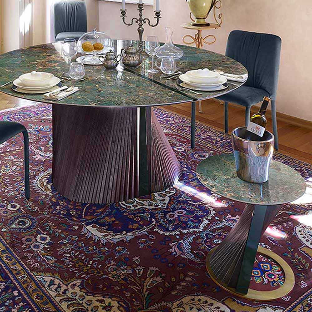 Mesa de centro design com tampo redondo em grés efeito mármore, item de luxo Made in Italy.