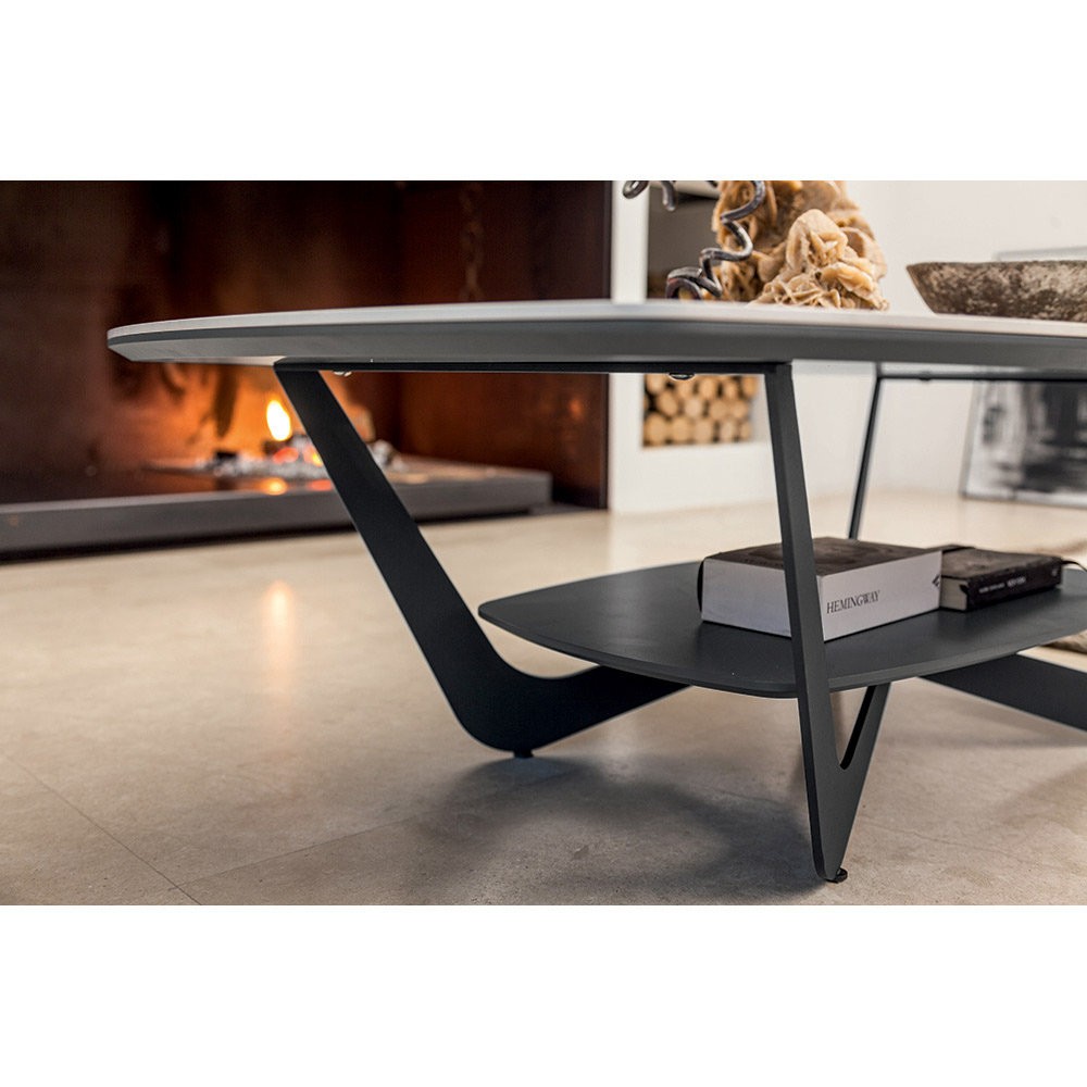 Mesa de centro em metal e tampo em cerâmica brilhante com arrumação, fabricado em Itália.