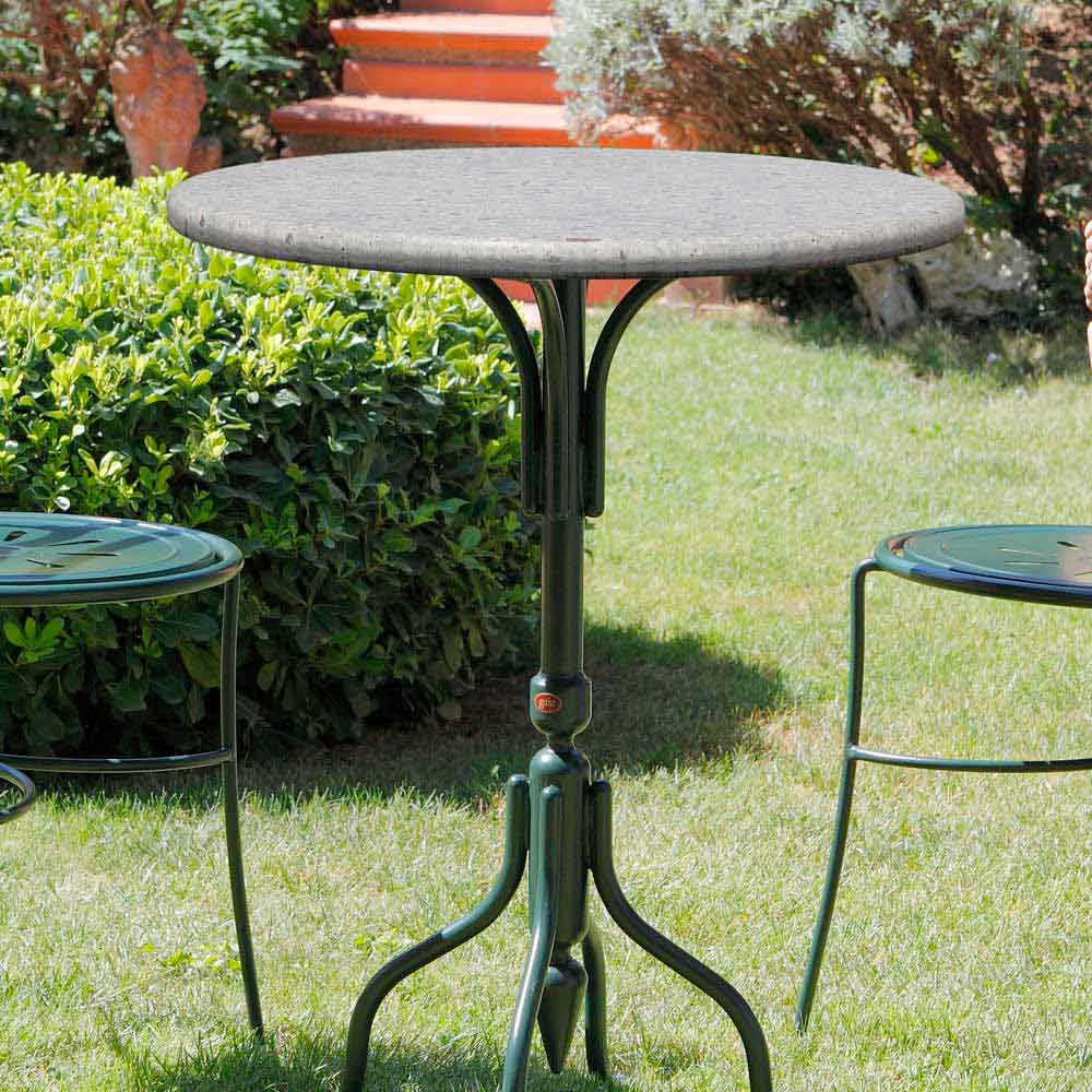 Mesa de centro ao ar livre artesanal na Itália com tampo redondo de pedra e base de ferro pintada de verde. Um acessório de mobiliário para ambientes externos caracterizado por características clássicas que remetem a um design do passado enriquecido e tornado único pelo acabamento particular que cobre toda a base, elementos distintivos da mesa de centro. O tampo em pedra, por outro lado, dá um toque exclusivo ao mesmo tempo que proporciona uma superfície de suporte sólida e resistente , bem como a estrutura que, graças à galvanização a quente, garante a ferrugem do metal durante décadas e uma excelente resistência a qualquer agente. corrosivo. O artesanato feito na Itália também nos permite oferecer um produto de alta qualidade que se destaca pela utilização de materiais exclusivos , atenção aos detalhes e acabamentos finos. O que nasce, portanto, é um produto funcional , durável e de alta qualidade.