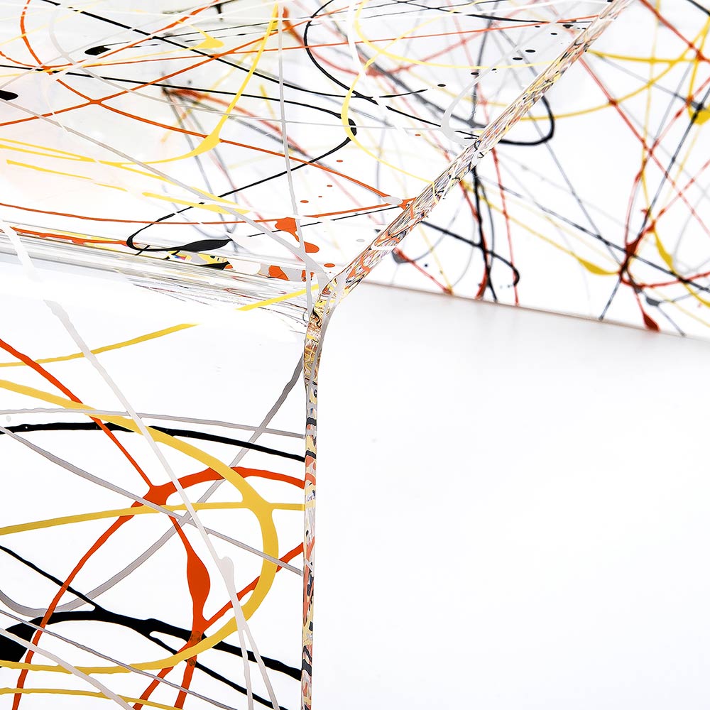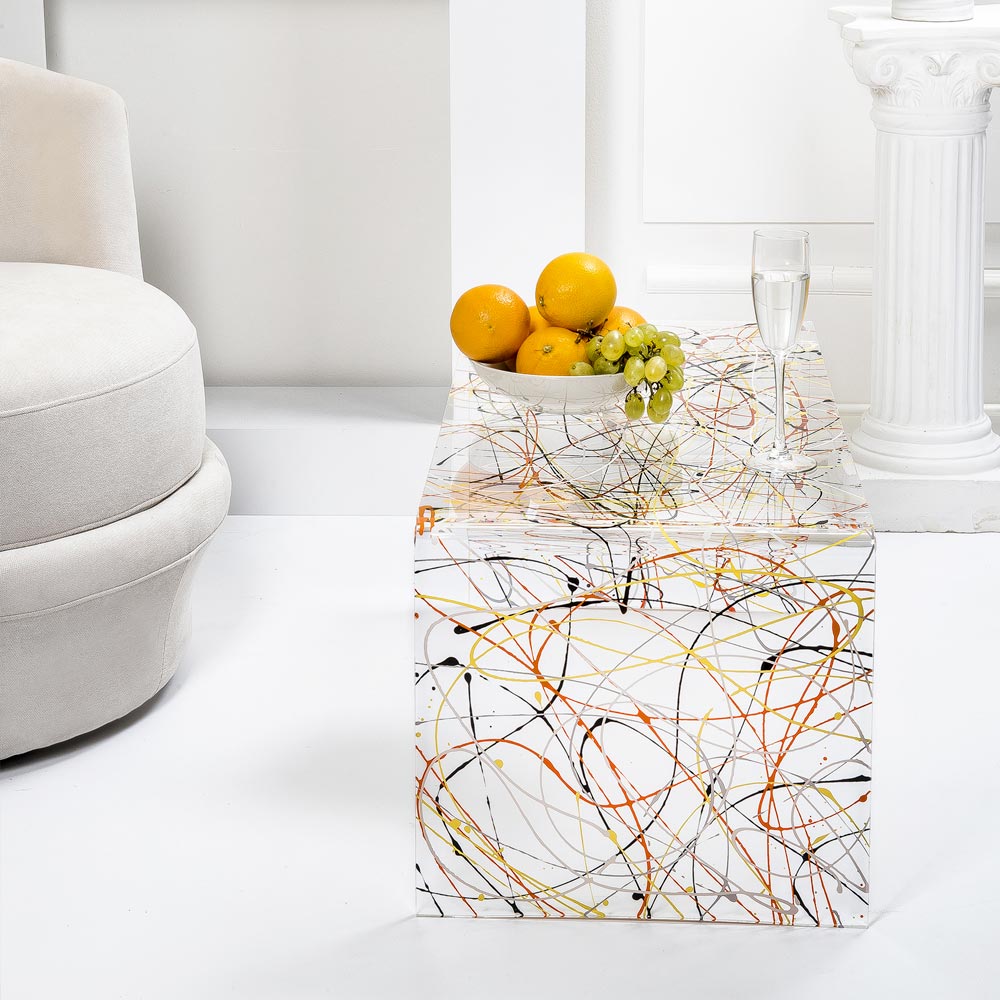 Mesa de centro concebida, desenhada e fabricada na Itália através da utilização de materiais inovadores e de qualidade como o plexiglass transparente com decorações multicoloridas , ideal por ser atóxico, hipoalergênico, inodoro, antibacteriano e 100% reciclável. Esta mesa de centro foi pensada para mobiliar a sala ou a área de dormir com bom gosto e funcionalidade, atuando como um elemento de decoração moderno, simples e versátil .