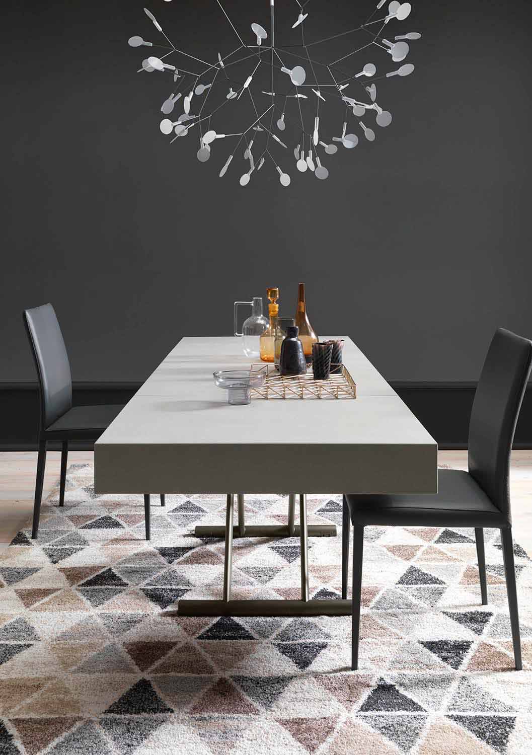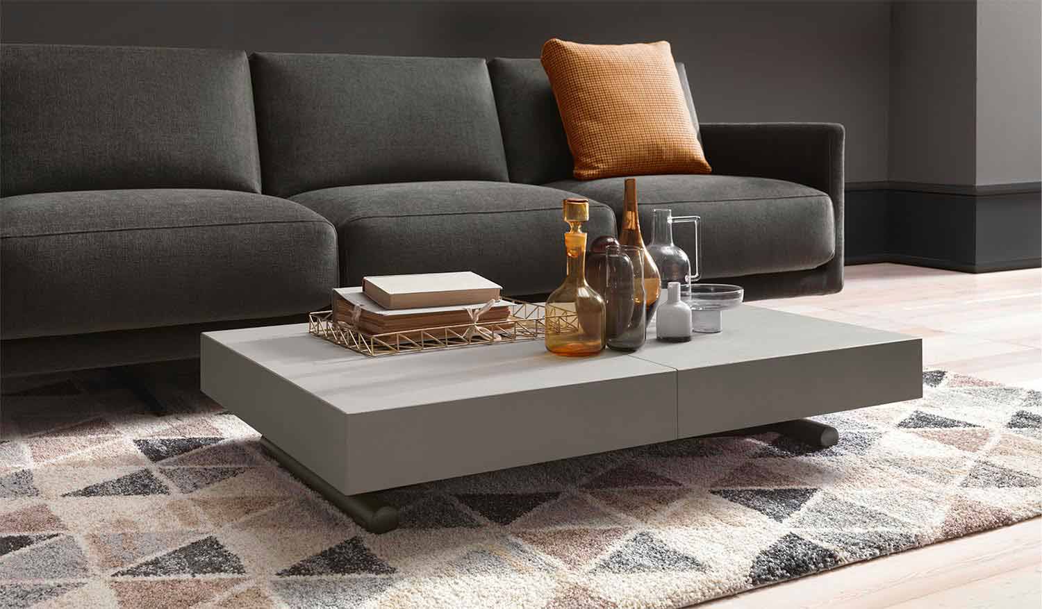 mesa de centro transformável é delineada por linhas refinadas e minimalistas capazes de mobiliar seus ambientes domésticos e corporativos com elegância e praticidade.