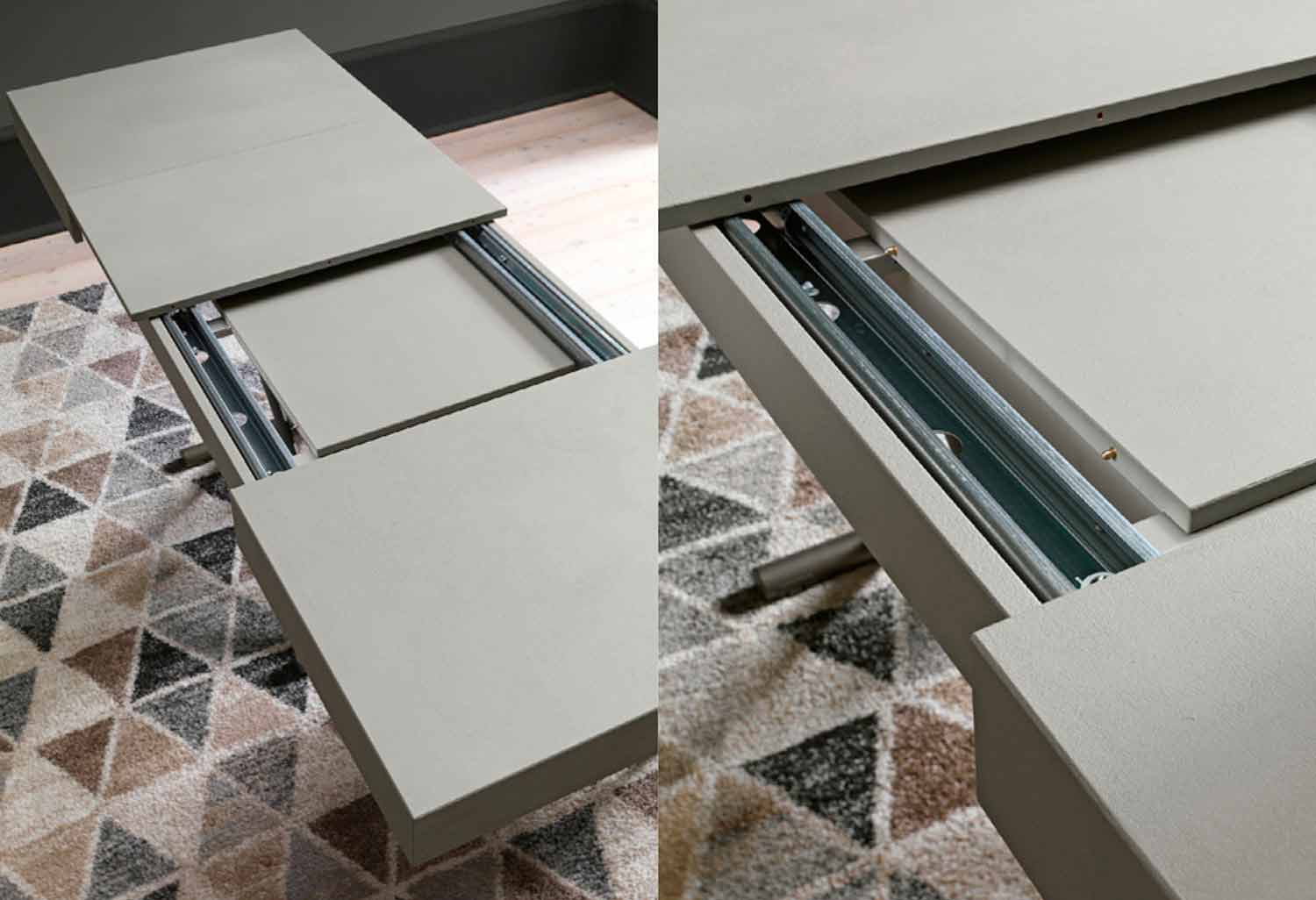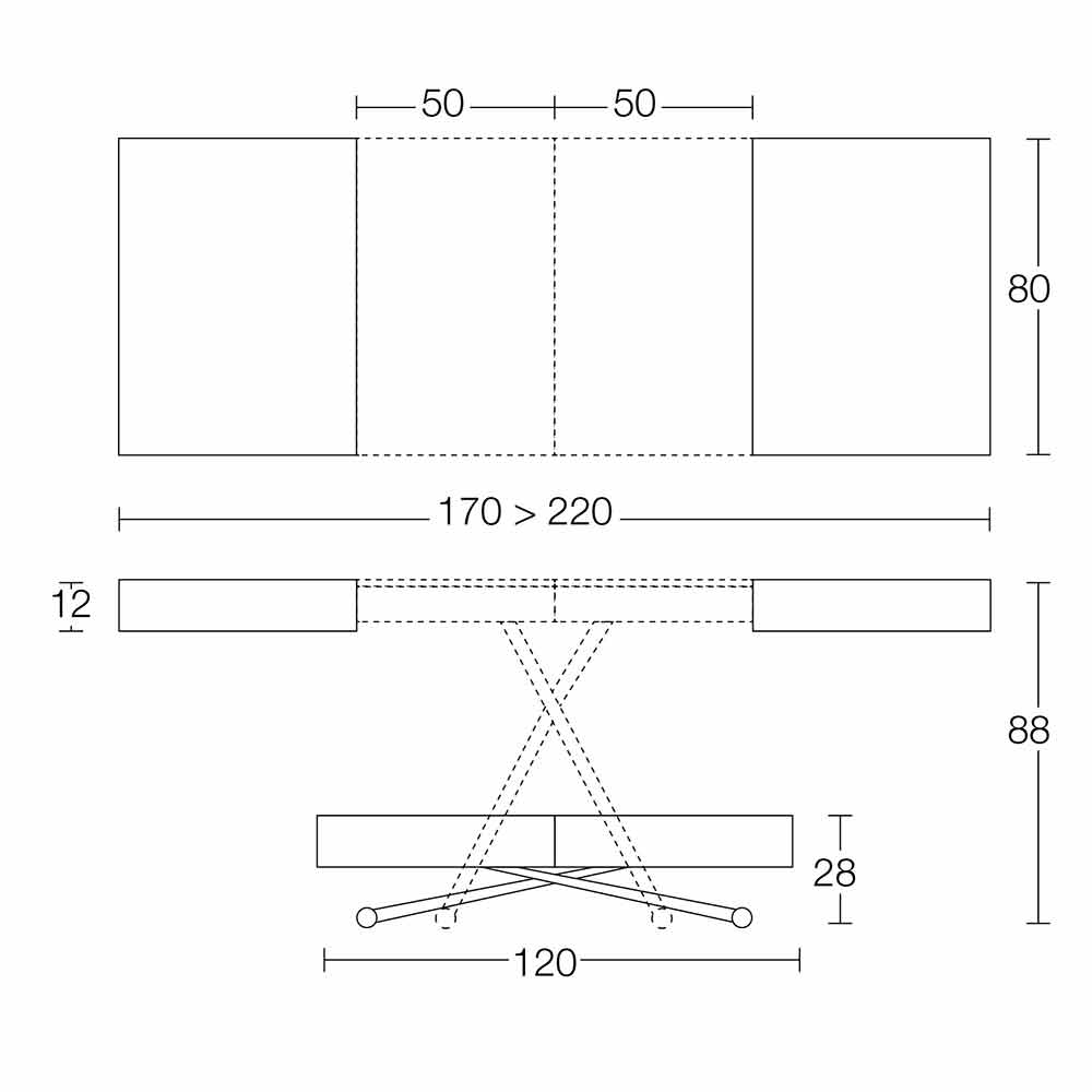 O tampo é retangular e extensível através de 2 extensões internas de 50 cm cada.