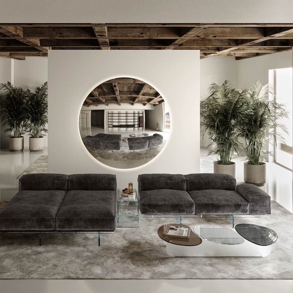 Esta mesa de centro apresenta-se como uma obra de arte funcional que combina elegância e versatilidade num único design sofisticado. As superfícies de vidro combinam harmoniosamente com elementos arredondados , criando um contraste visual atraente e prático.