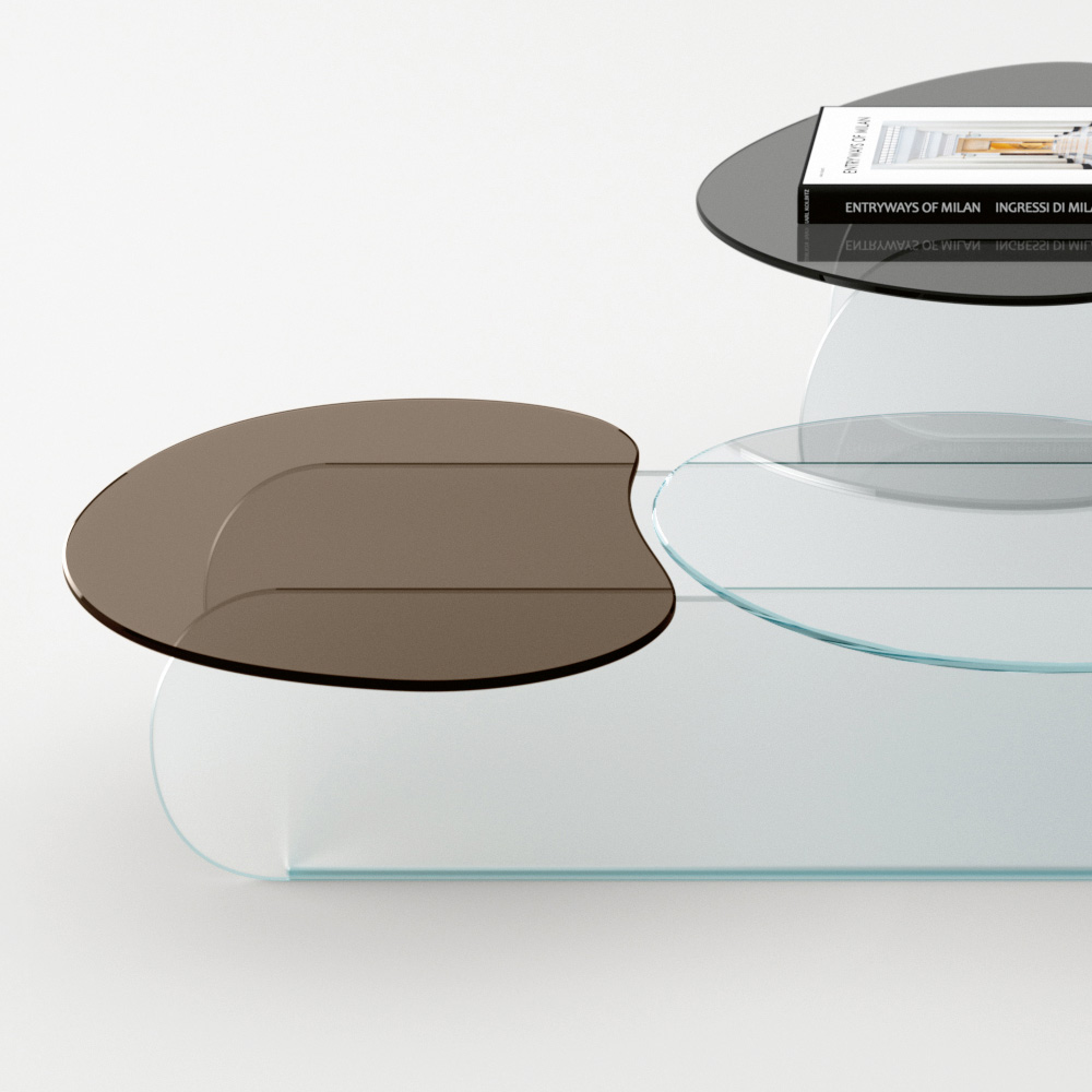 A composição inovadora de superfícies transparentes e coloridas não só aumenta a percepção do espaço, mas também oferece a praticidade do uso diário, ideal para quem procura uma peça de design que seja tanto centro de conversa quanto de utilidade. Elegante e multifuncional, esta mesa é uma escolha diferenciada para quem aprecia um design que fala a linguagem da modernidade e da funcionalidade .