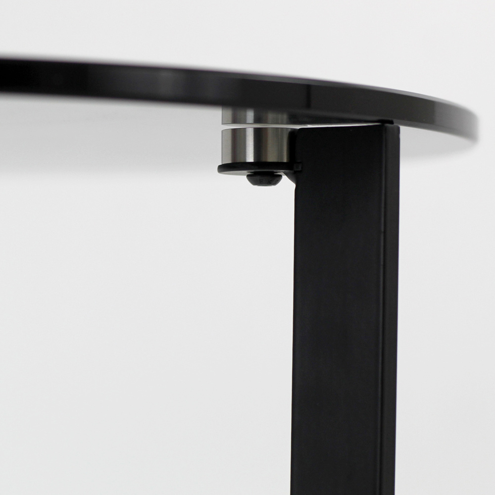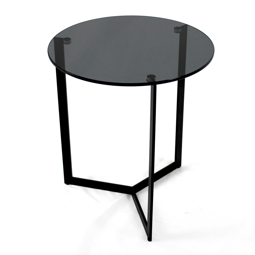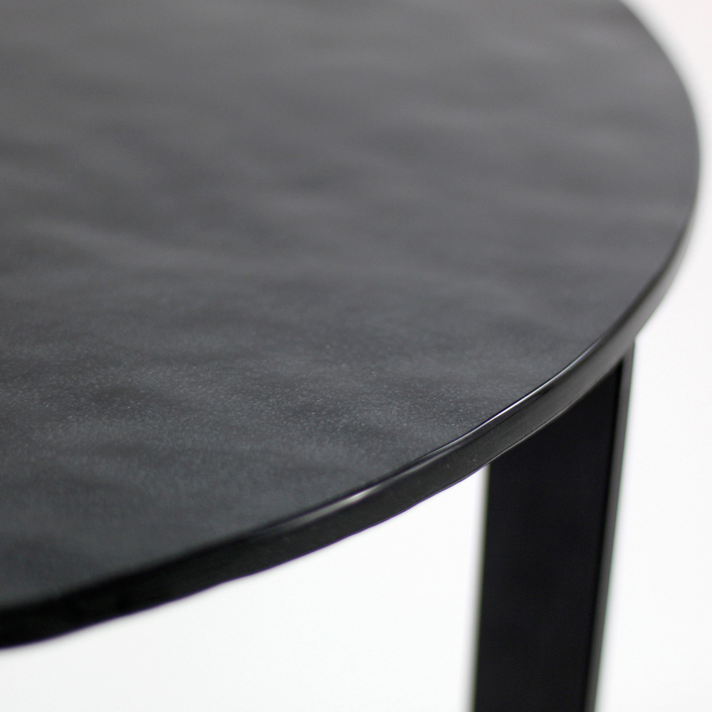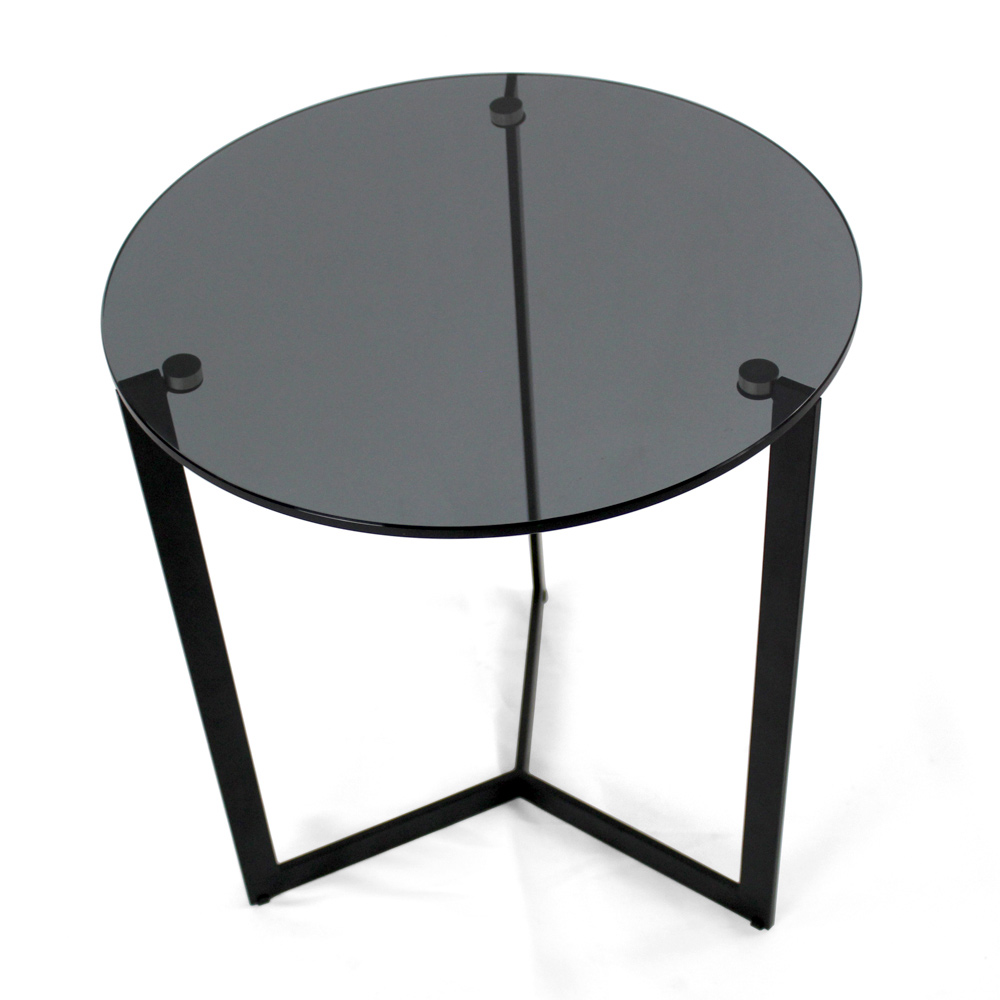 Mesa redonda com base em aço pintado e tampo de vidro.