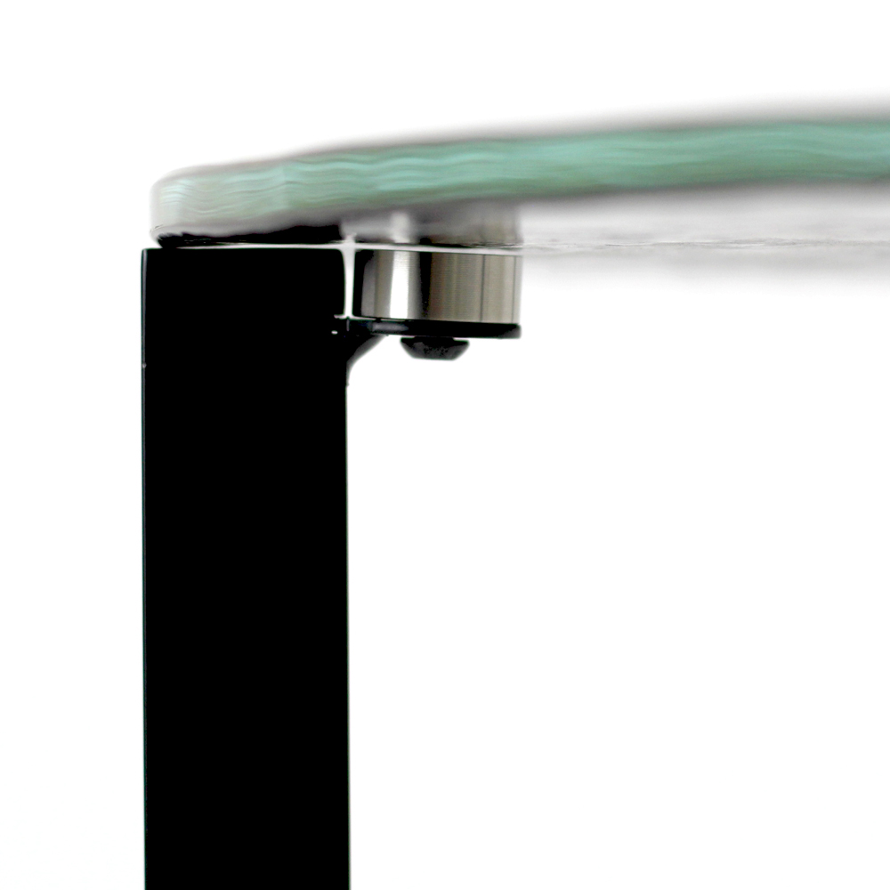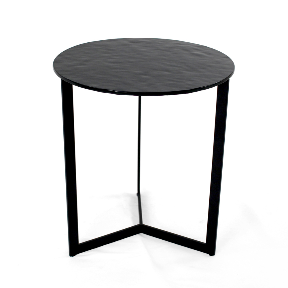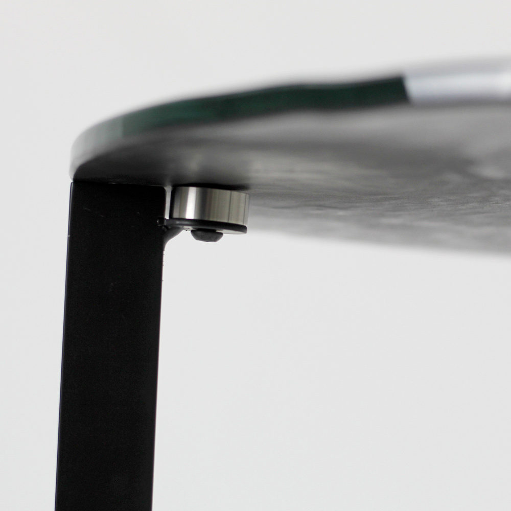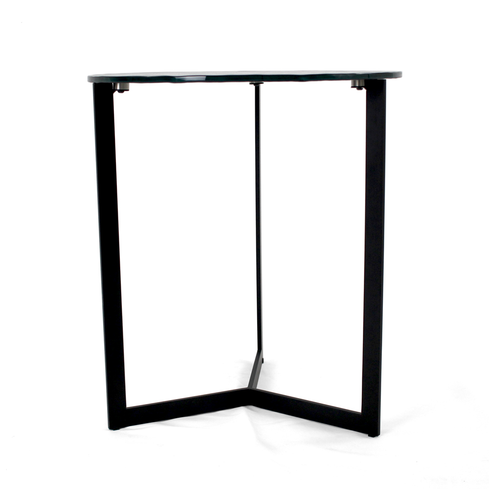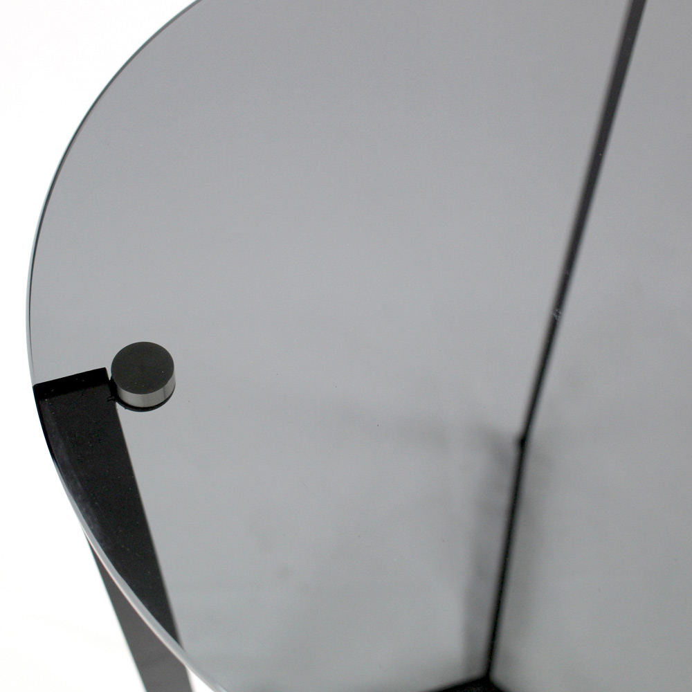 Mesa redonda com base em aço pintado e tampo de vidro.