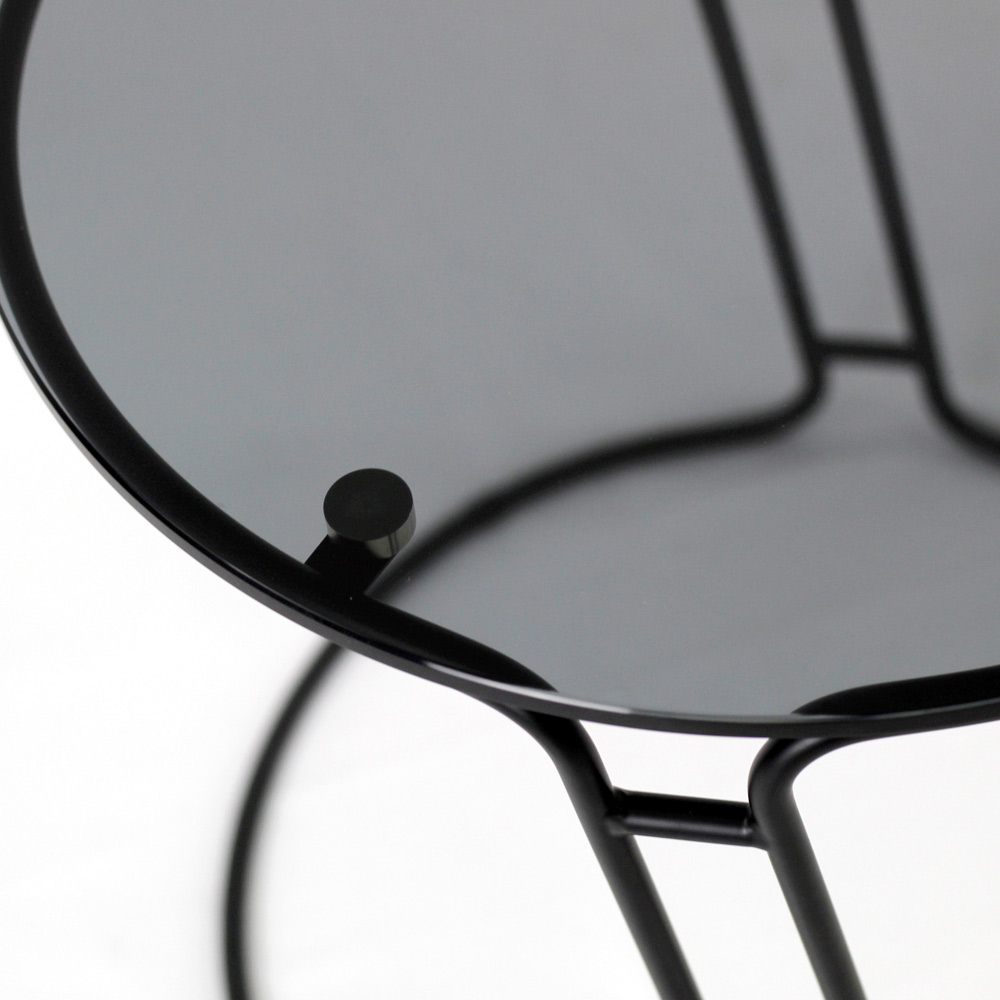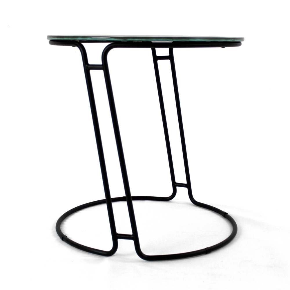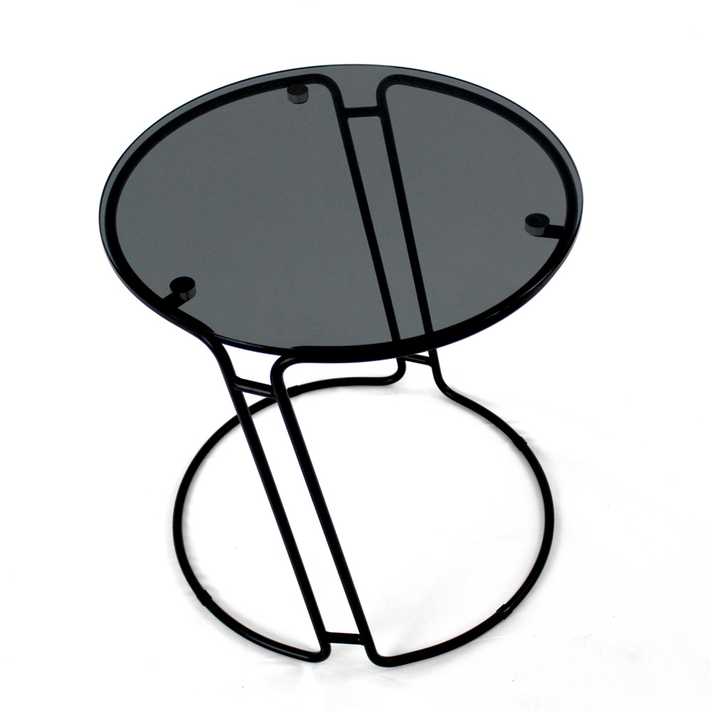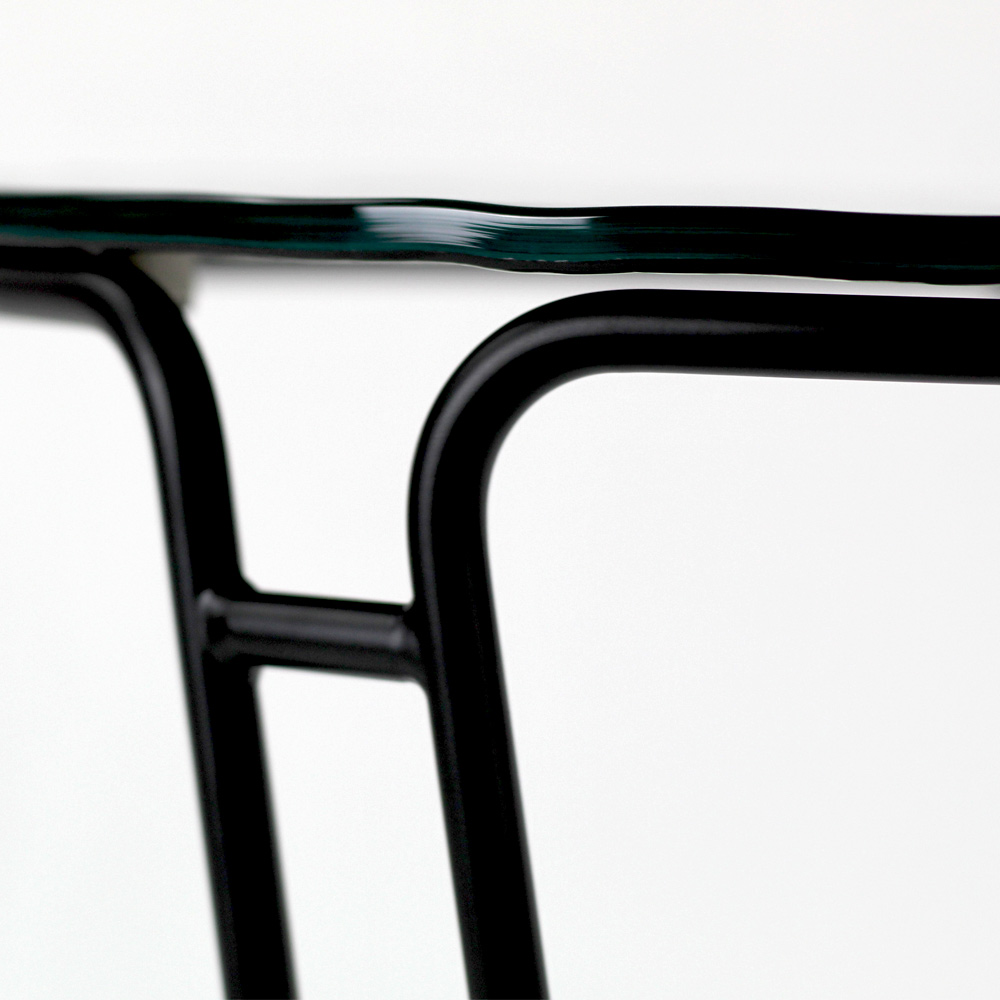 Mesa de centro redonda com base em aço pintado e tampo de vidro.