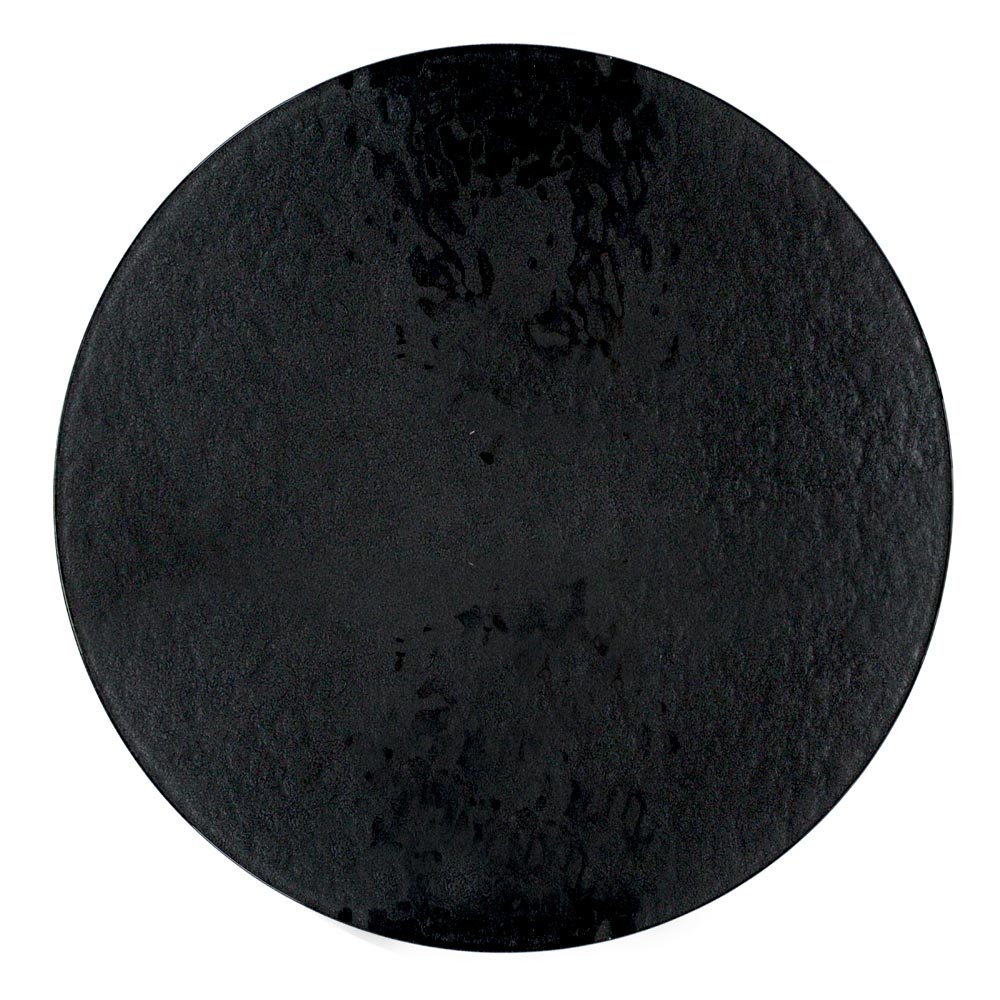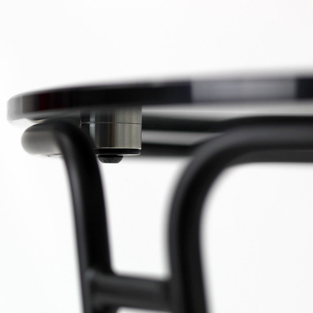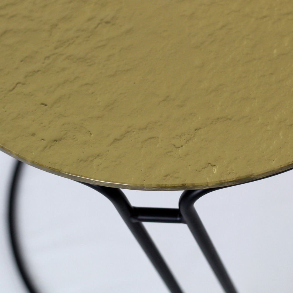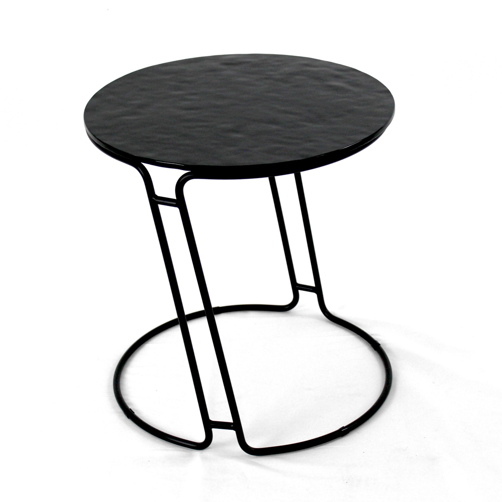 Mesa de centro redonda com base em aço pintado e tampo de vidro.
