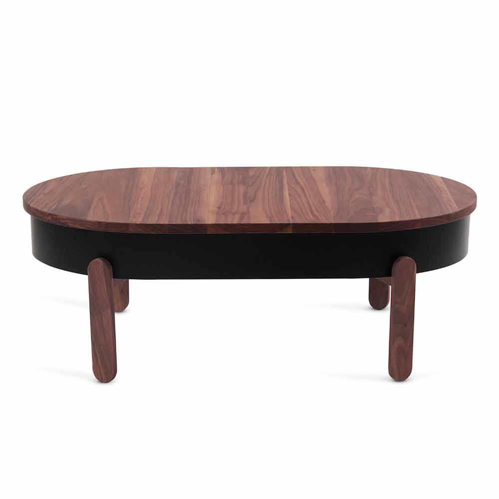 Mesa de centro moderna em carvalho maciço e aço lacado.