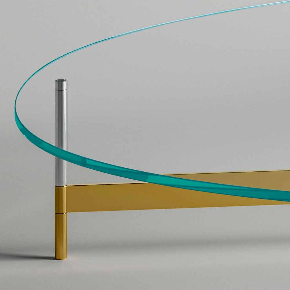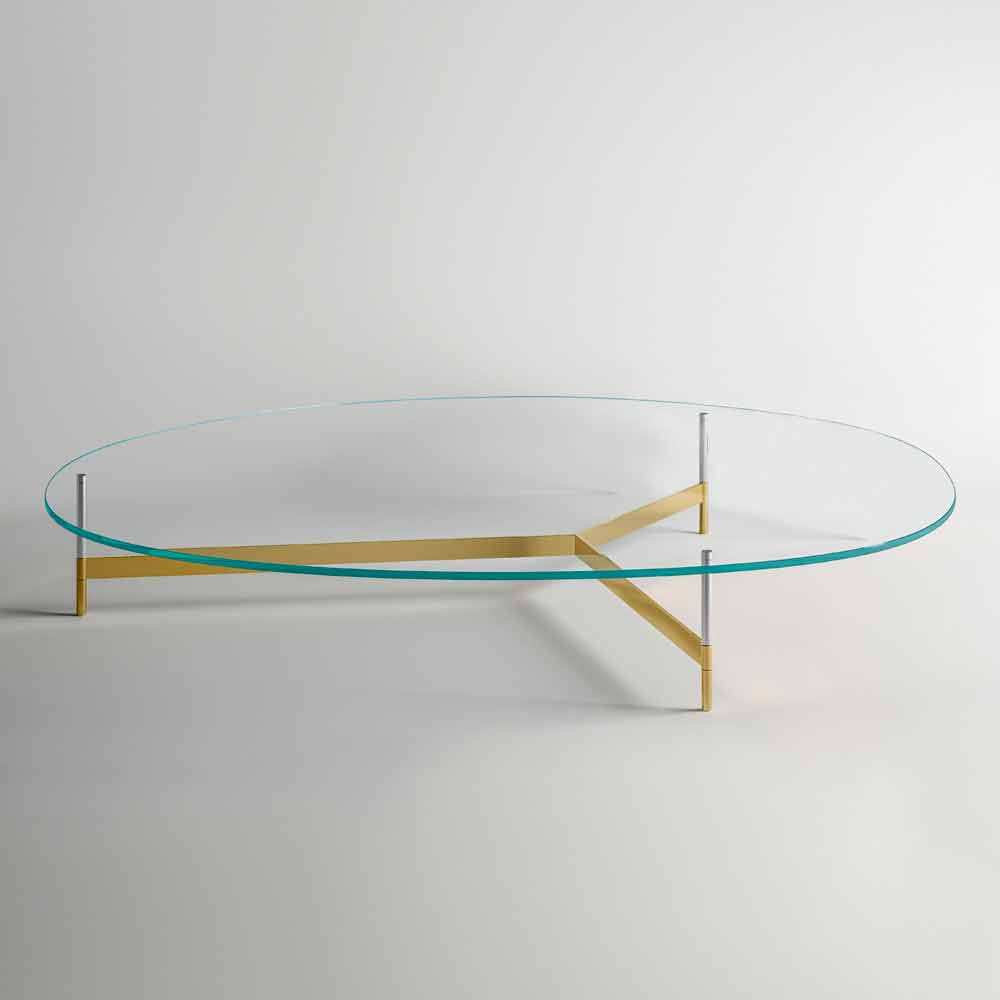 Mesa de centro design com tampo em vidro e base metálica Made in Italy.