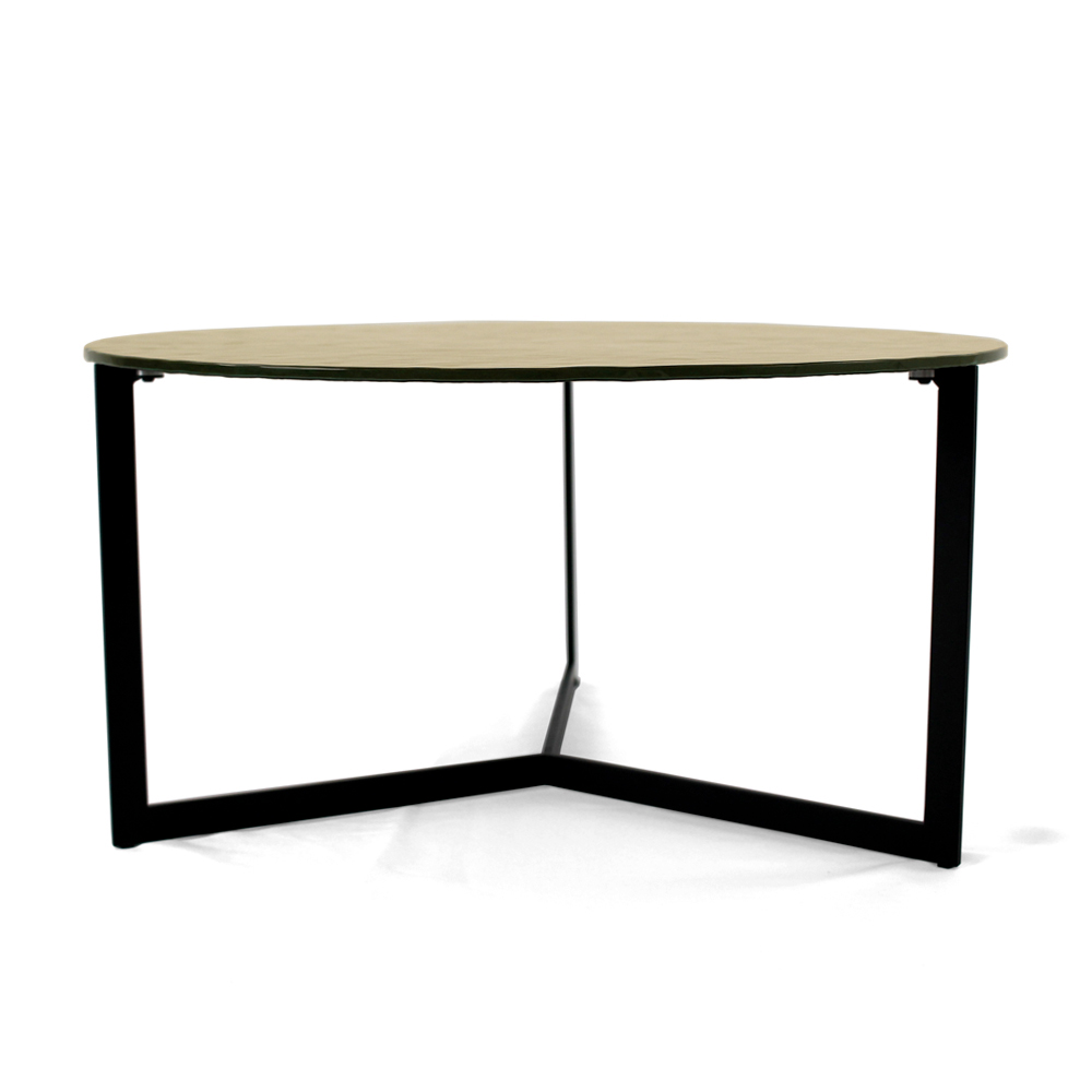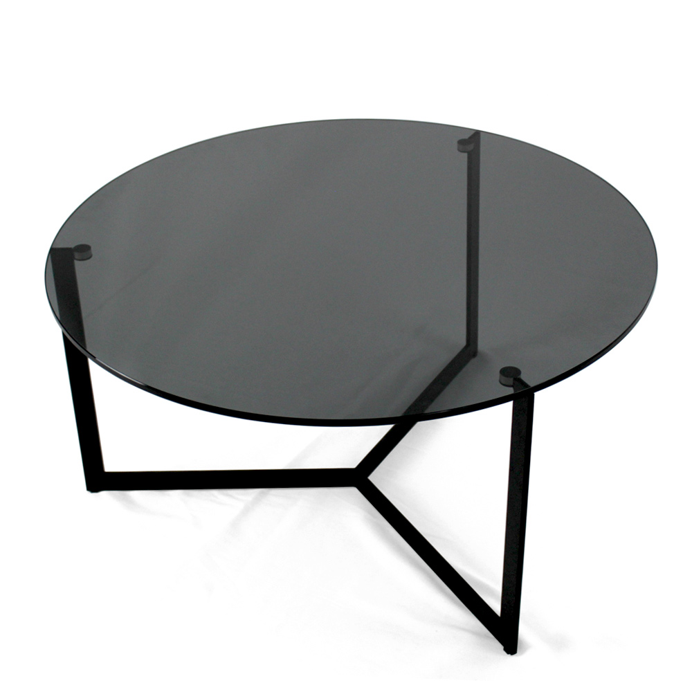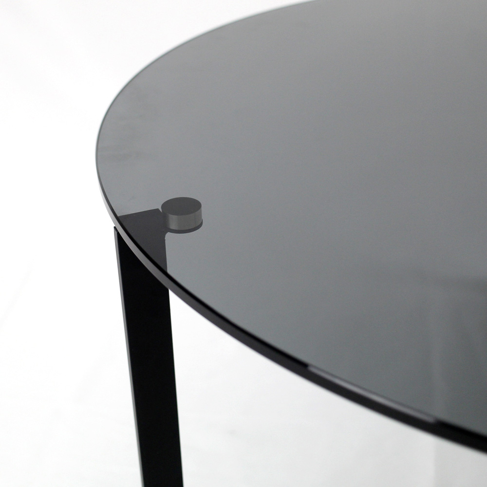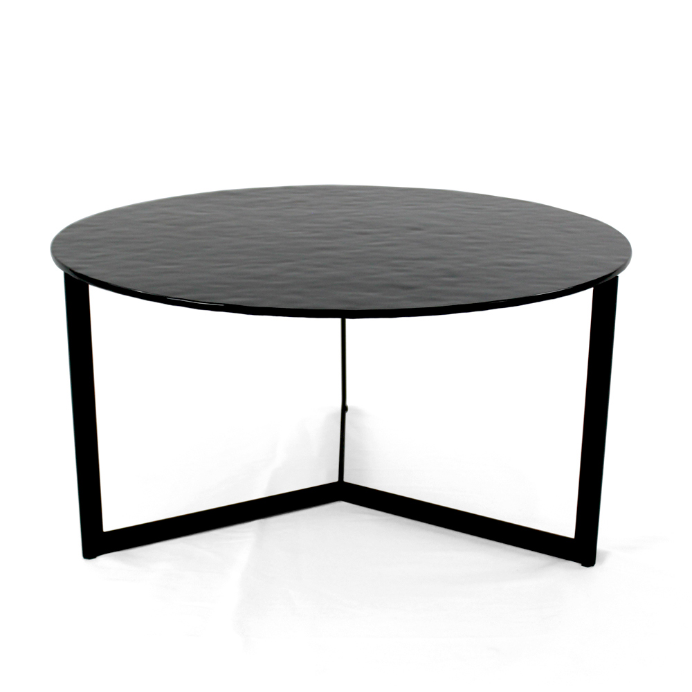 Mesa de centro redonda com base em aço pintado e tampo de vidro.
