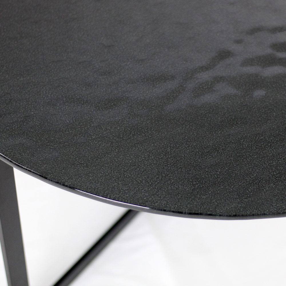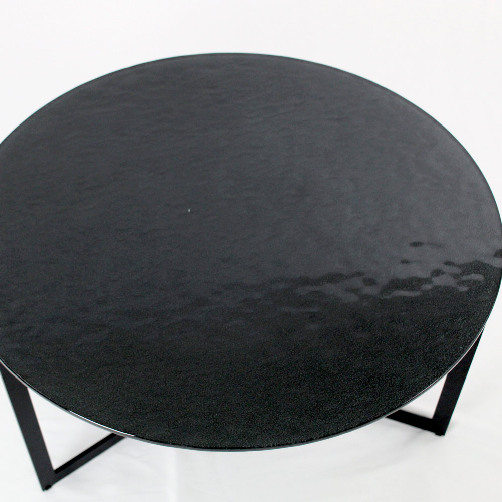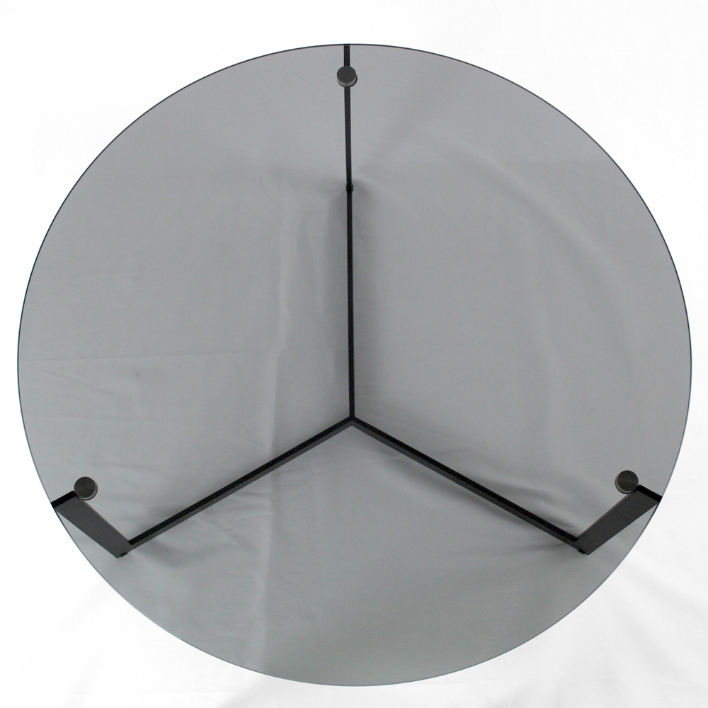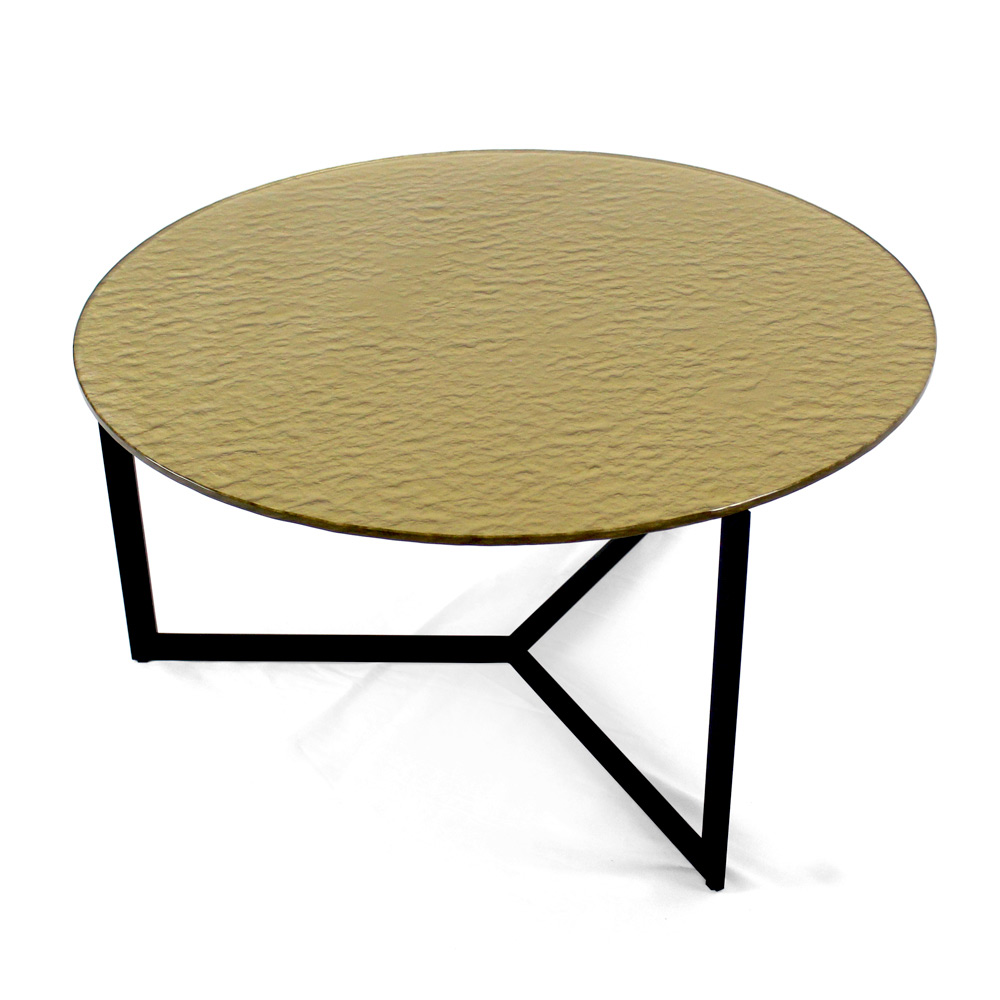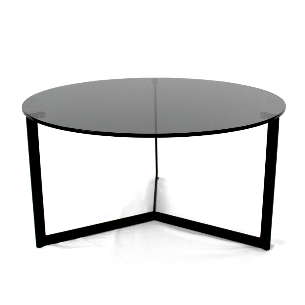Mesa de centro redonda com base em aço pintado e tampo de vidro.