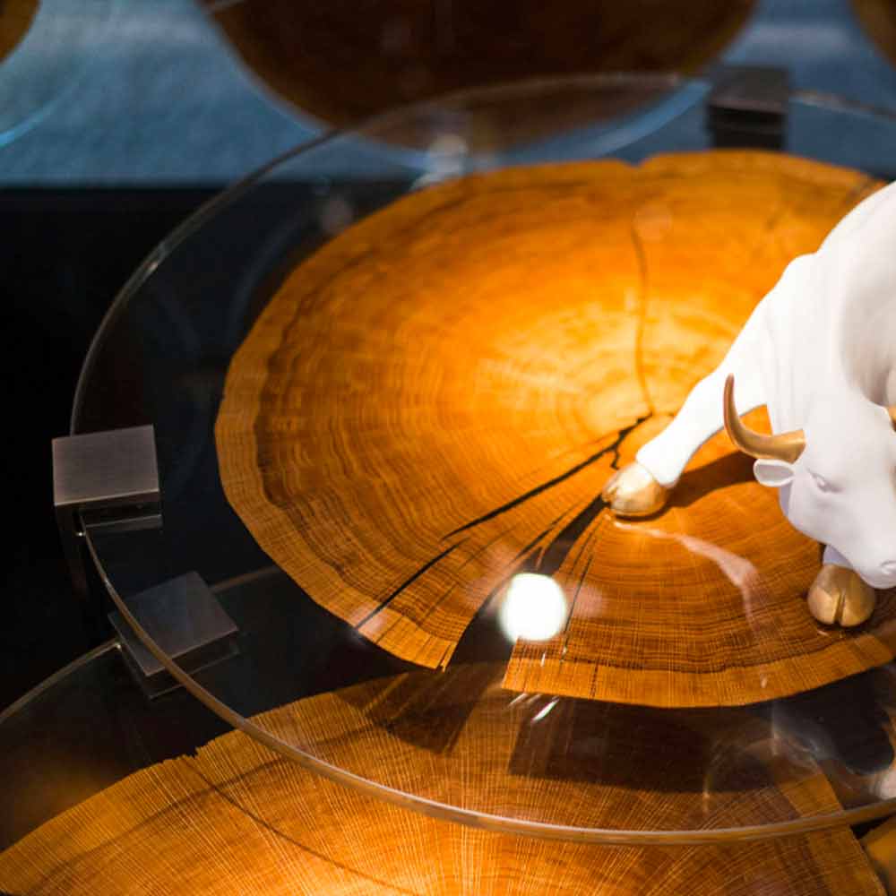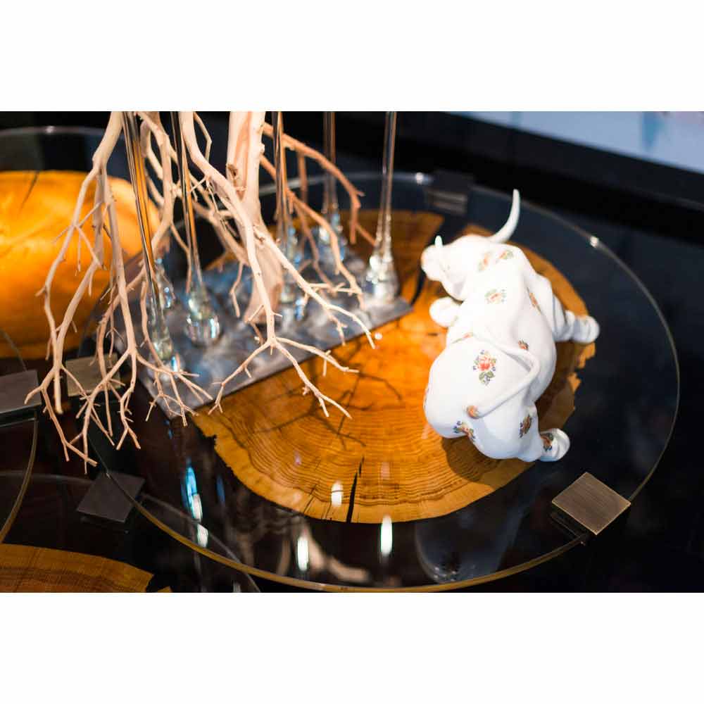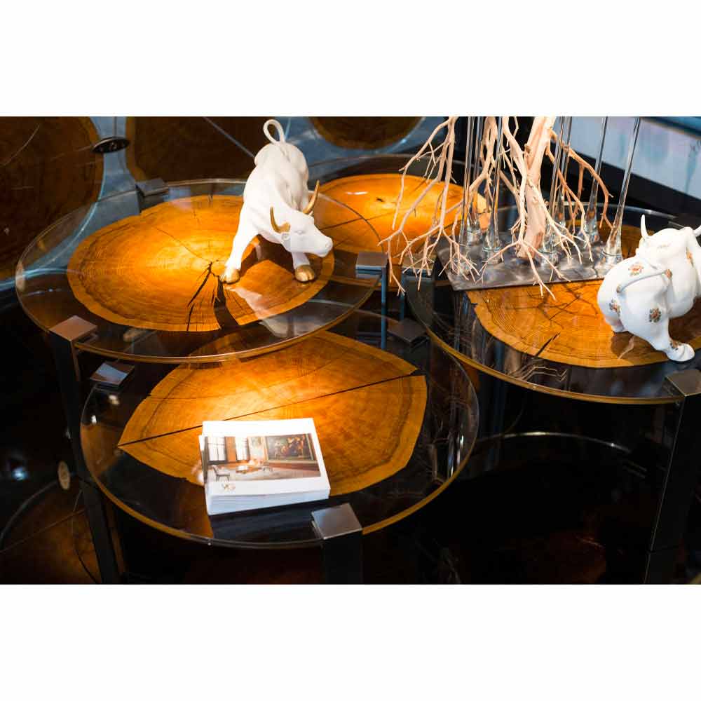 Mesa de centro feita na Itáliacom tampo redondo em vidro acoplado (5 + 5 mm) no interior do qual se insere uma fina secção de madeira recortada , suportada por 3 pés metálicos com acabamento em latão polido . Da combinação exclusiva do toque requintado do vidro, das cores maravilhosas da madeira e da estética moderna do metal, nasce uma solução de mobiliário única que alicerça a sua ideia em conceitos de inovação e elegância para um resultado vanguardista com forte personalidade. contemporâneo . A sua força é representada pela combinação perfeita de acabamentos e materiais que valorizam a mesa de centro, sem nunca descurar o aspecto funcional fundamental sublinhado pela mão de obra 100% Made in Italy e a utilização de matérias-primas de qualidade permitindo oferecer um acessório de decoração com uma beleza revolucionária e ao mesmo tempo particularmente sólida e resistente .