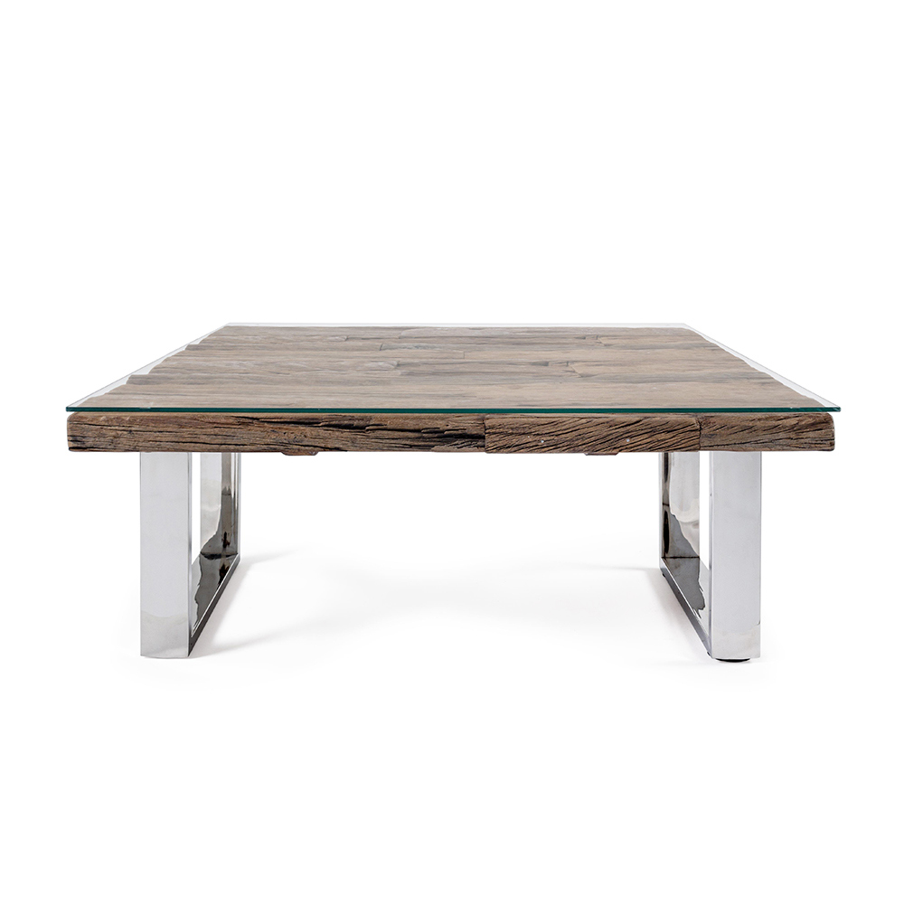 Esta mesa de centro é feita com um acabamento natural, tampo de madeira reciclada e vidro temperado com pés de aço inoxidável para montar.