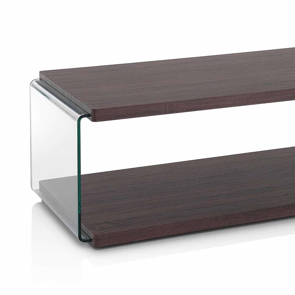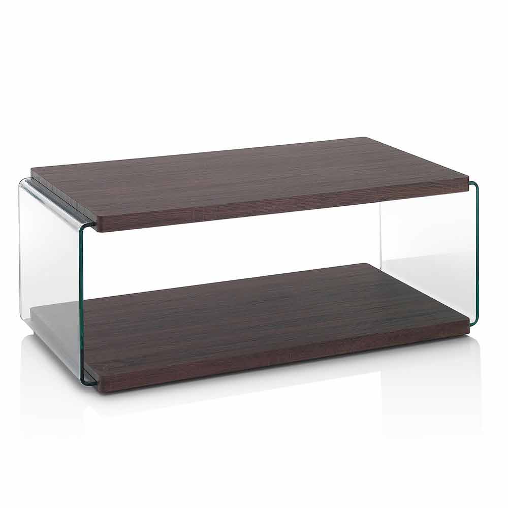 Mesa de centro baixa de design moderno em vidro curvo transparente.