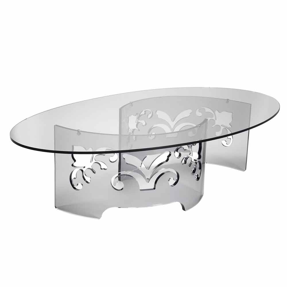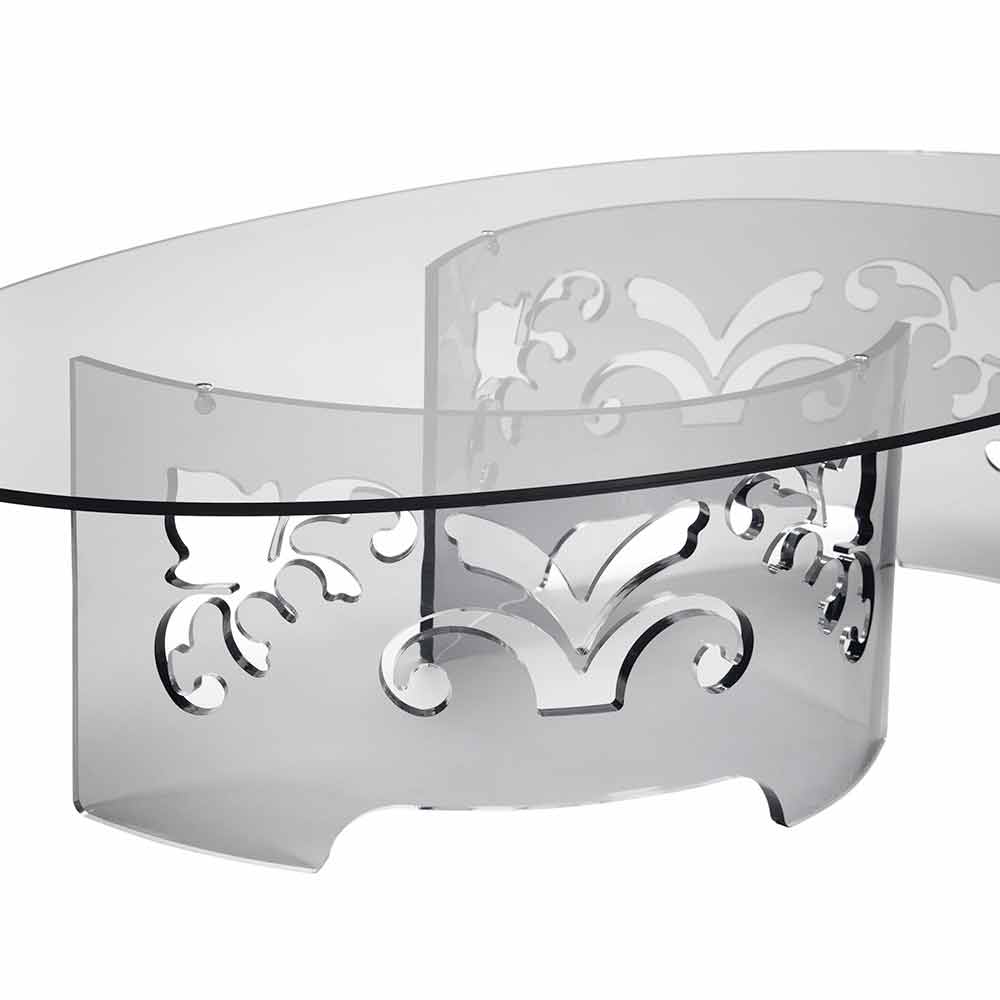 Mesa de centro oval em plexiglass transparente ou fumê com base entalhada a laser made in Italy.