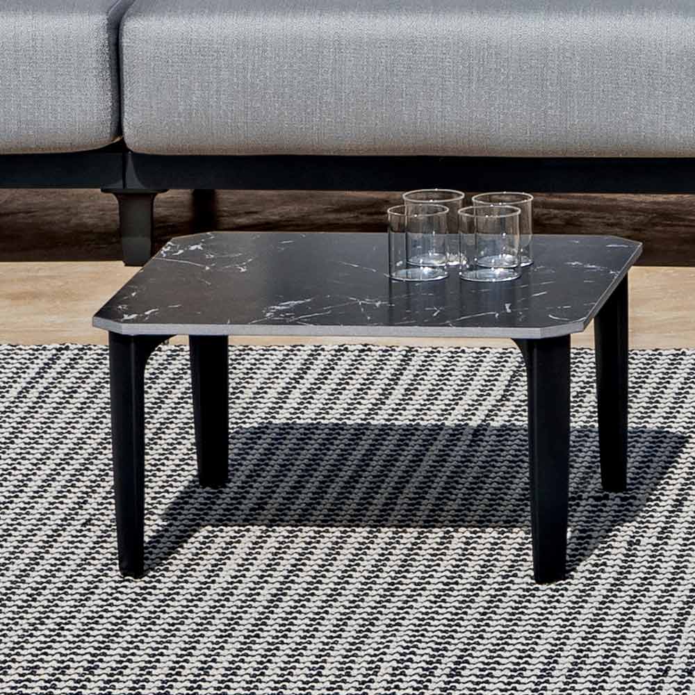 Mesa de centro baixa para exterior em alumínio e tampo quadrado em grés porcelanato, artigo de alta qualidade fabricado na Itália.