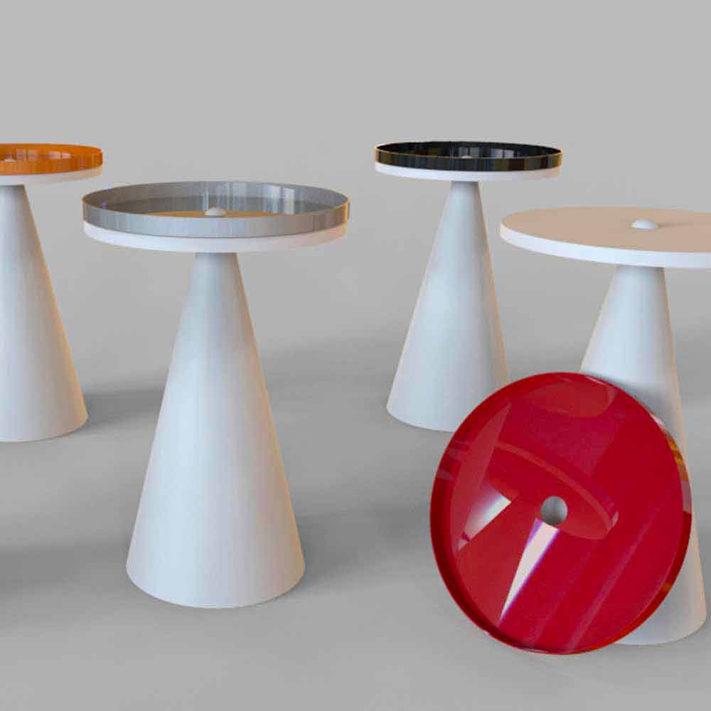 A base, em afamatx branco mate, contrasta com o tampo superior em chapa pintada brilhante. Este último pode ser usado separadamente, aumentando a usabilidade da bandeja e ao mesmo tempo garantindo uma superfície de suporte dupla.