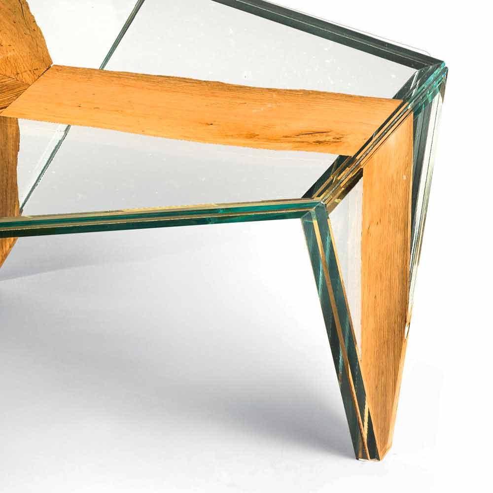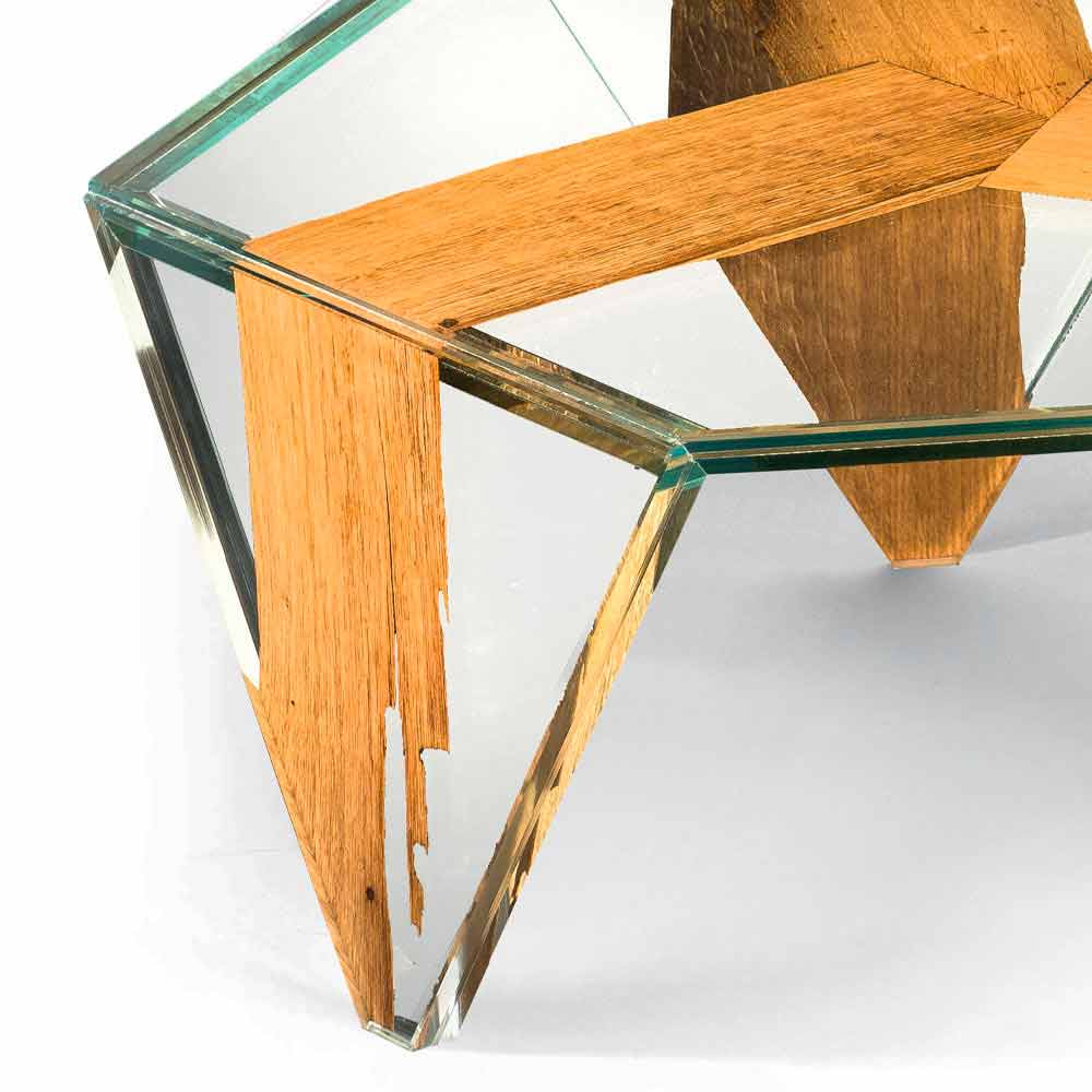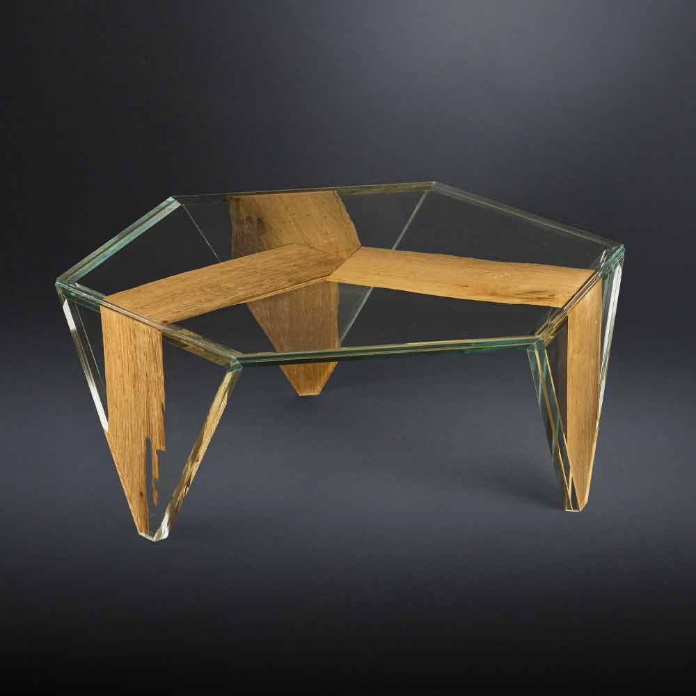 Mesa de centro com tampo hexagonal totalmente fabricado na Itália em vidro acoplado (10 + 10 mm) no interior do qual é inserida uma delgada lâmina de bricola de carvalho. Da união do encanto da madeira com os seus veios que remetem à natureza e à elegância intemporal do vidro , que relembra a transparência da água, nasce um acessório de decoração exclusivo , caracterizado por uma personalidade forte e requintada . A sua força é representada pela forma original e pela maravilhosa combinação de acabamentos e materiais que aumentam o seu valor sem nunca descurar o aspecto funcional fundamental sublinhado pela obra 100% Made in Italy e pela utilização de matérias-primas de qualidade. para oferecer a mesa de centro perfeita, ideal para completar com estilo qualquer sala de estar com um gosto contemporâneo.