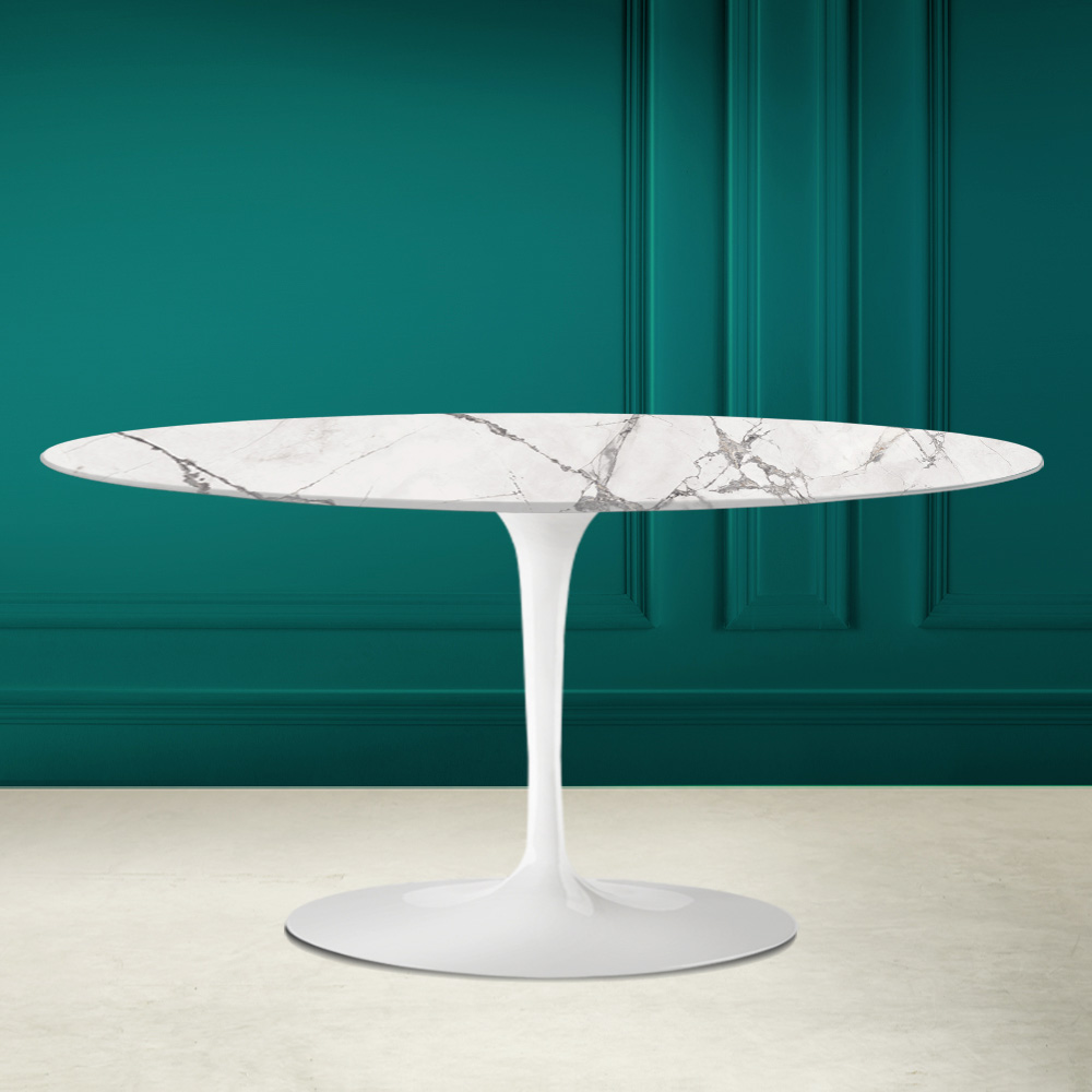 Mesa de centro oval com tampo em cerâmica invisível selecionada, efeito mármore statuarietto fosco e base