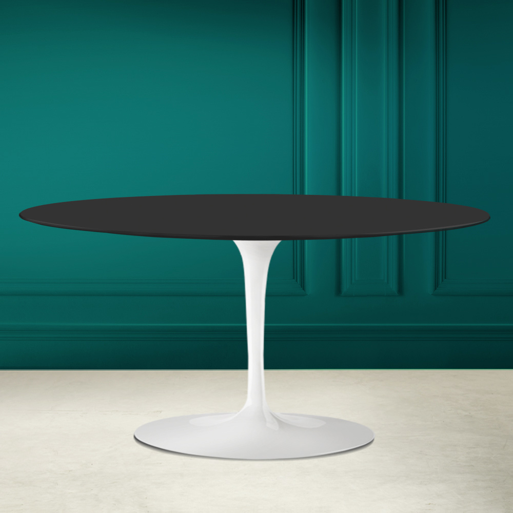 Mesa de centro oval com tampo em cerâmica preta macia, efeito preto fosco suave e base