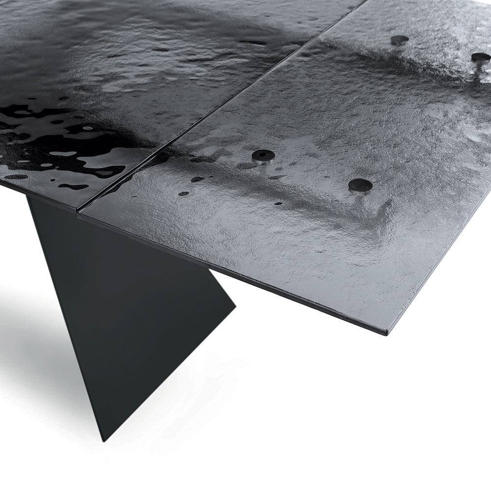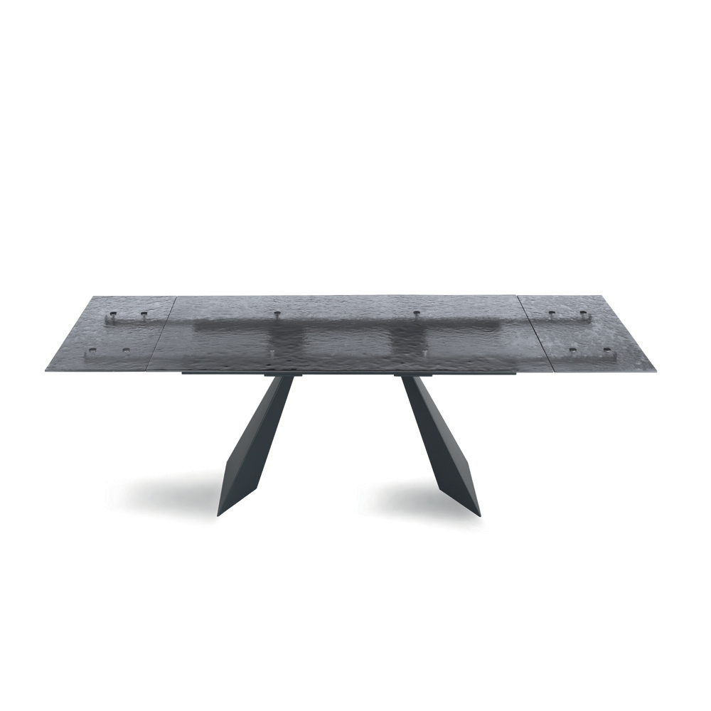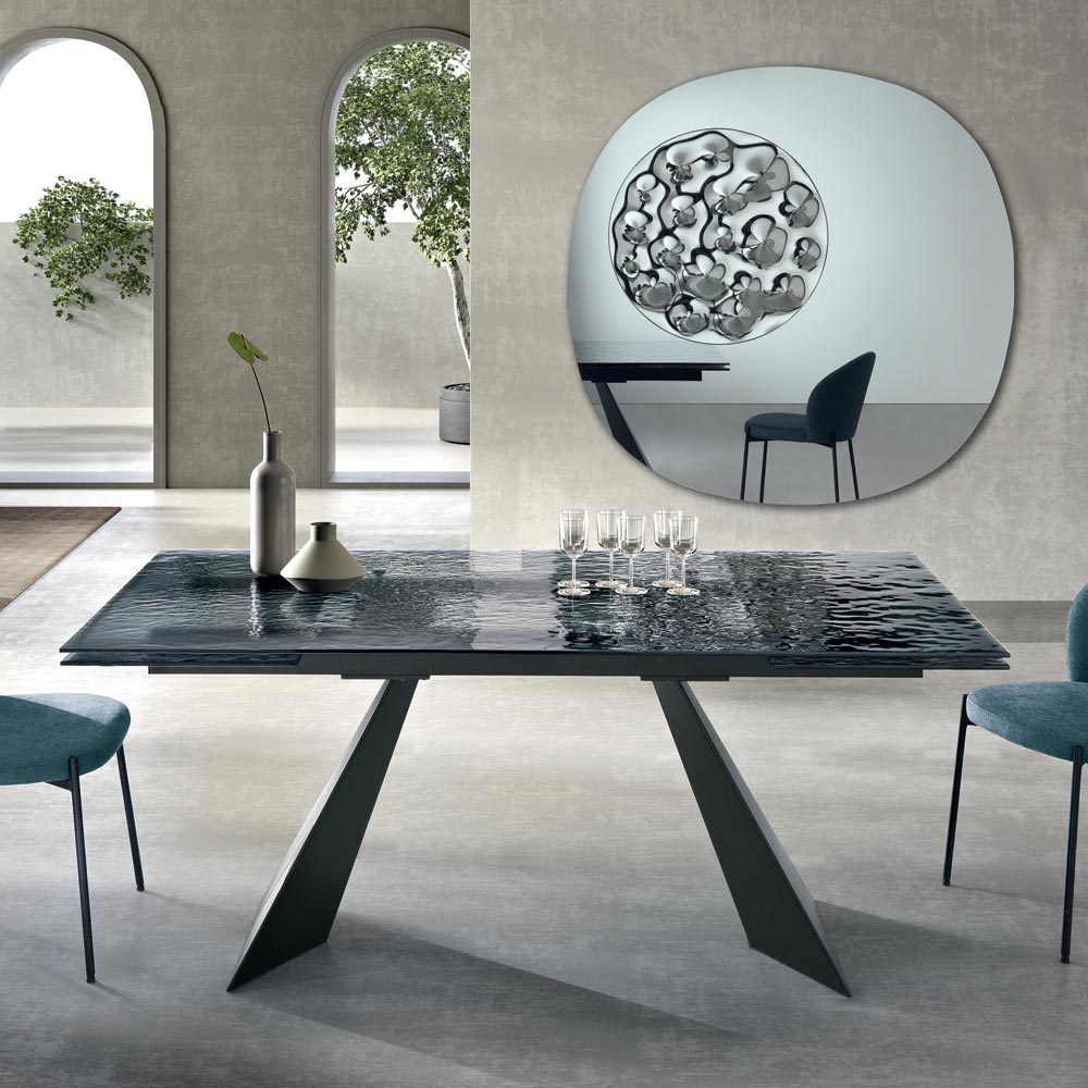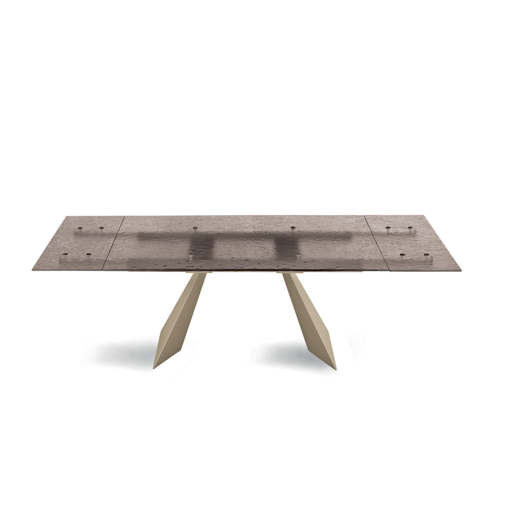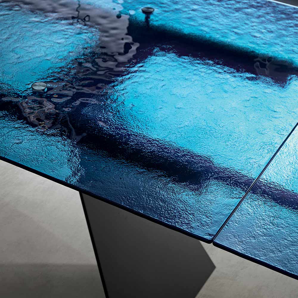 Esta mesa de jantar representa uma interpretação inovadora do design moderno, combinando materiais de alta qualidade e uma forma escultural que cativa o olhar. O tampo, em vidro martelado , é uma verdadeira obra de arte: cada detalhe da sua superfície reflete a luz de forma única, criando um jogo de reflexos e transparências que confere profundidade e interesse visual ao espaço.