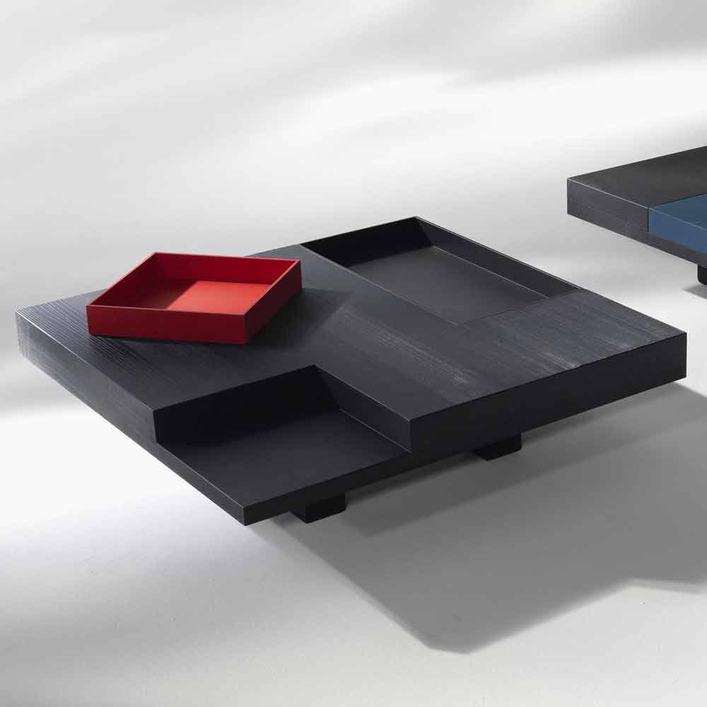 Mesa de centro quadrada com insertos de bandeja Iris, design moderno Mesa de café Designer equipado com bandejas removíveis. O tampo da mesa contém 2 bandejas, uma de 30x30 cm e outra de 30x60 cm. Acabamento: madeira de lariço escovado. As bandejas estão disponíveis na seguinte cor: lacado preto, lacado vermelho, lacado azul ou lacado amarelo. Veja a cartela de cores e escreva na caixa apropriada o código da cor desejada.