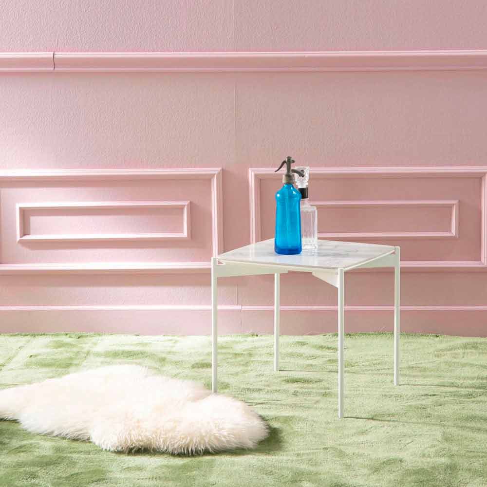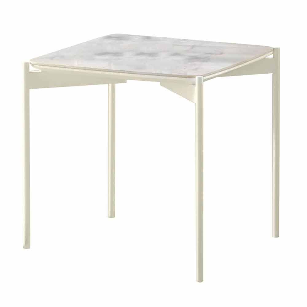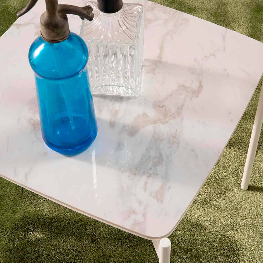 Istrice é uma mesa de centro quadrada feita com um tampo de MDF com uma placa de cerâmica no topo e uma estrutura de metal.
