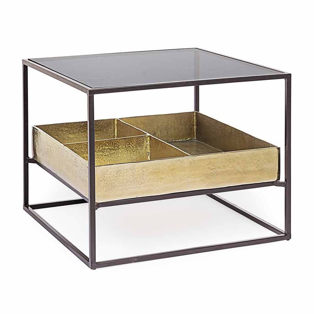 Mesa de centro de estilo industrial com tampo em vidro e estrutura em aço.
