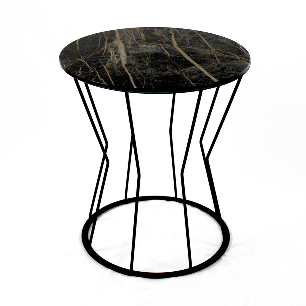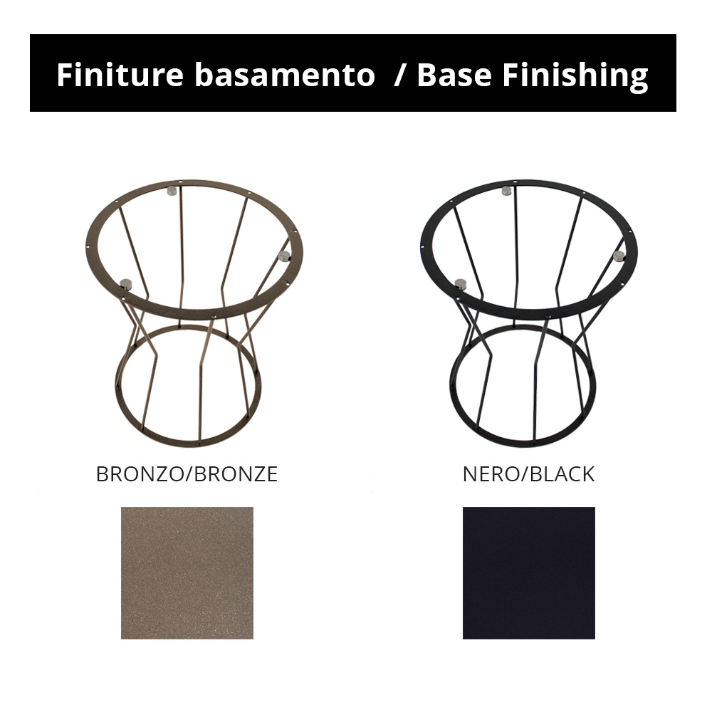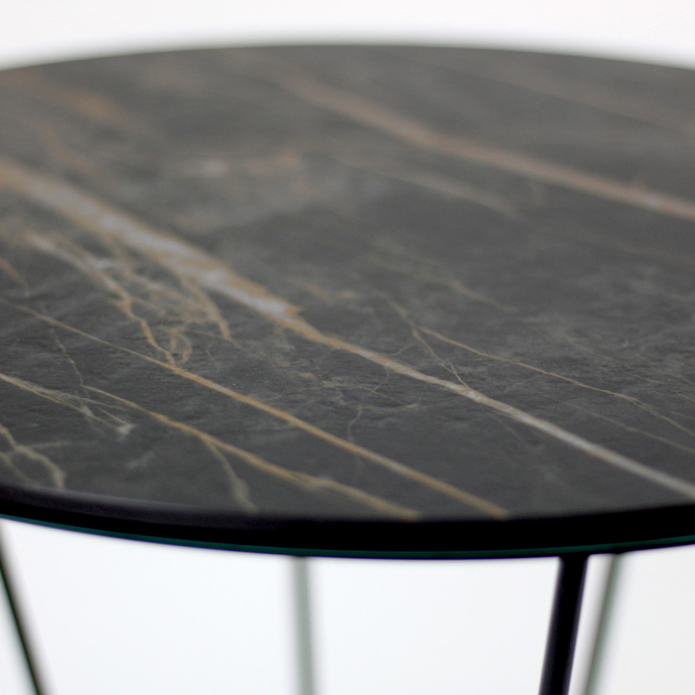 Mesa de centro redonda com base em aço pintado e tampo em grés porcelânico.