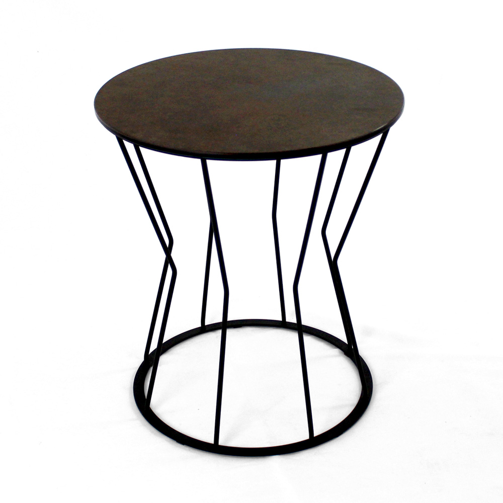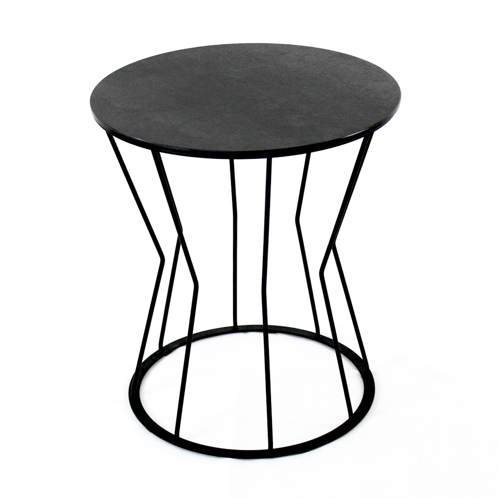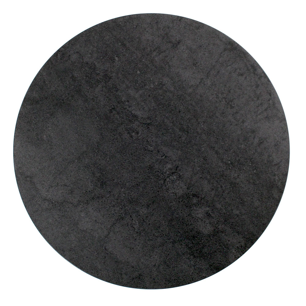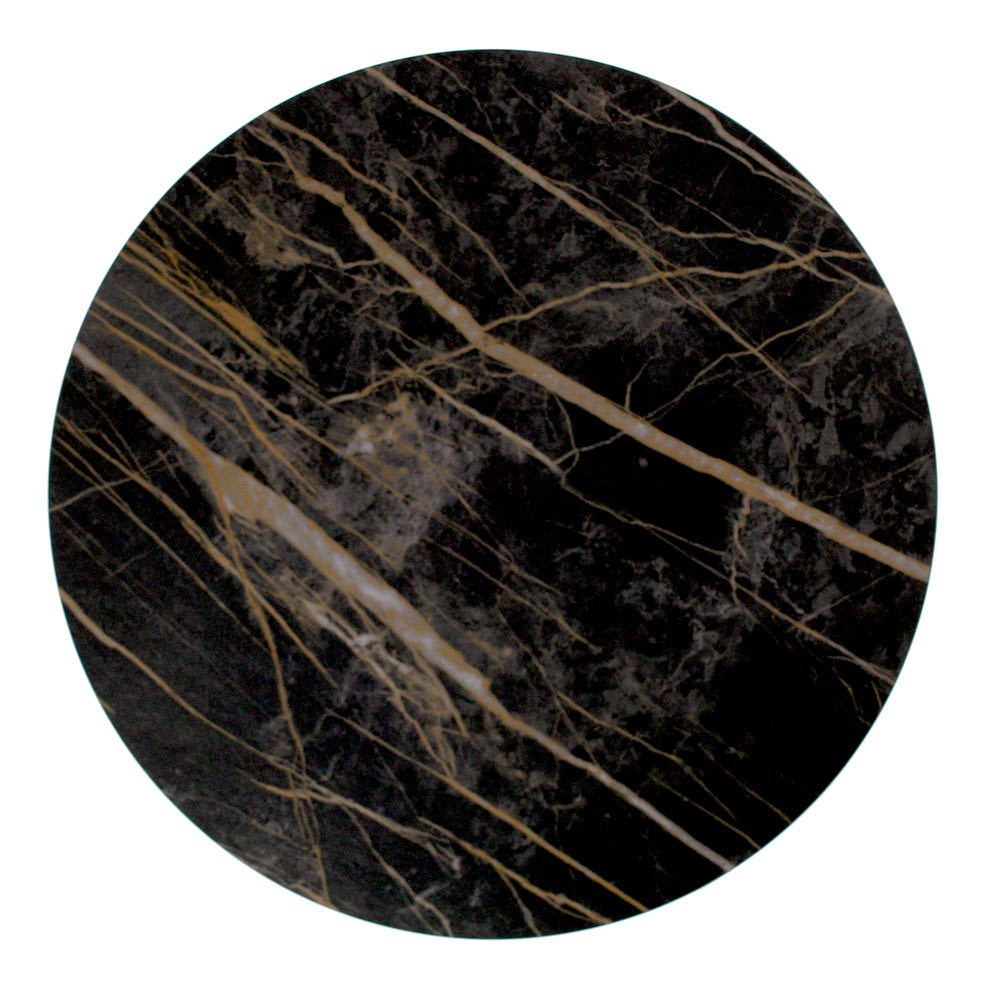 Mesa de centro redonda com base em aço pintado e tampo em grés porcelânico.