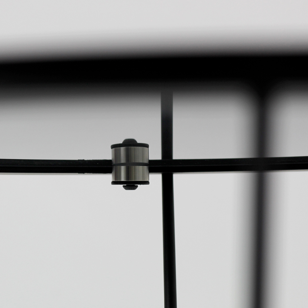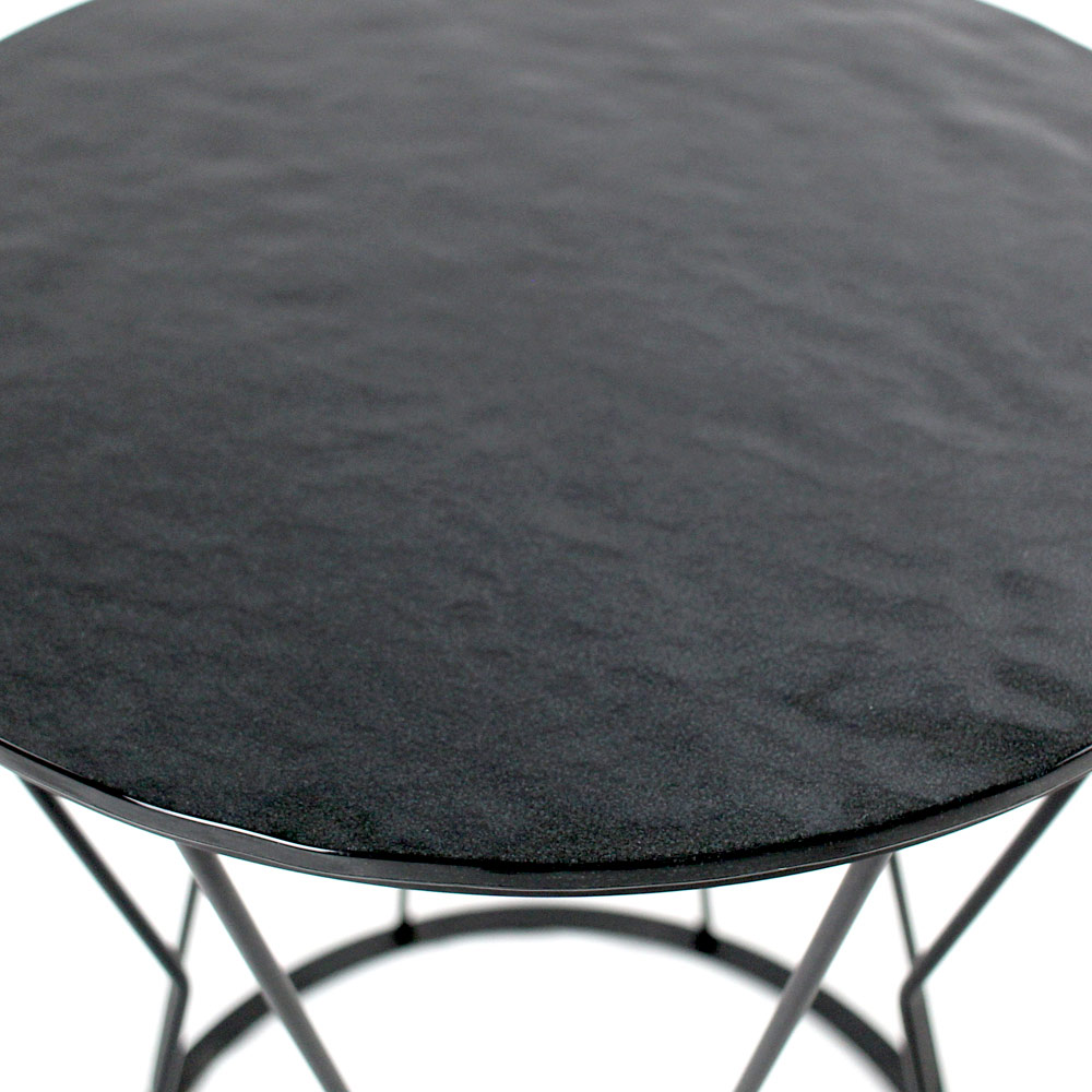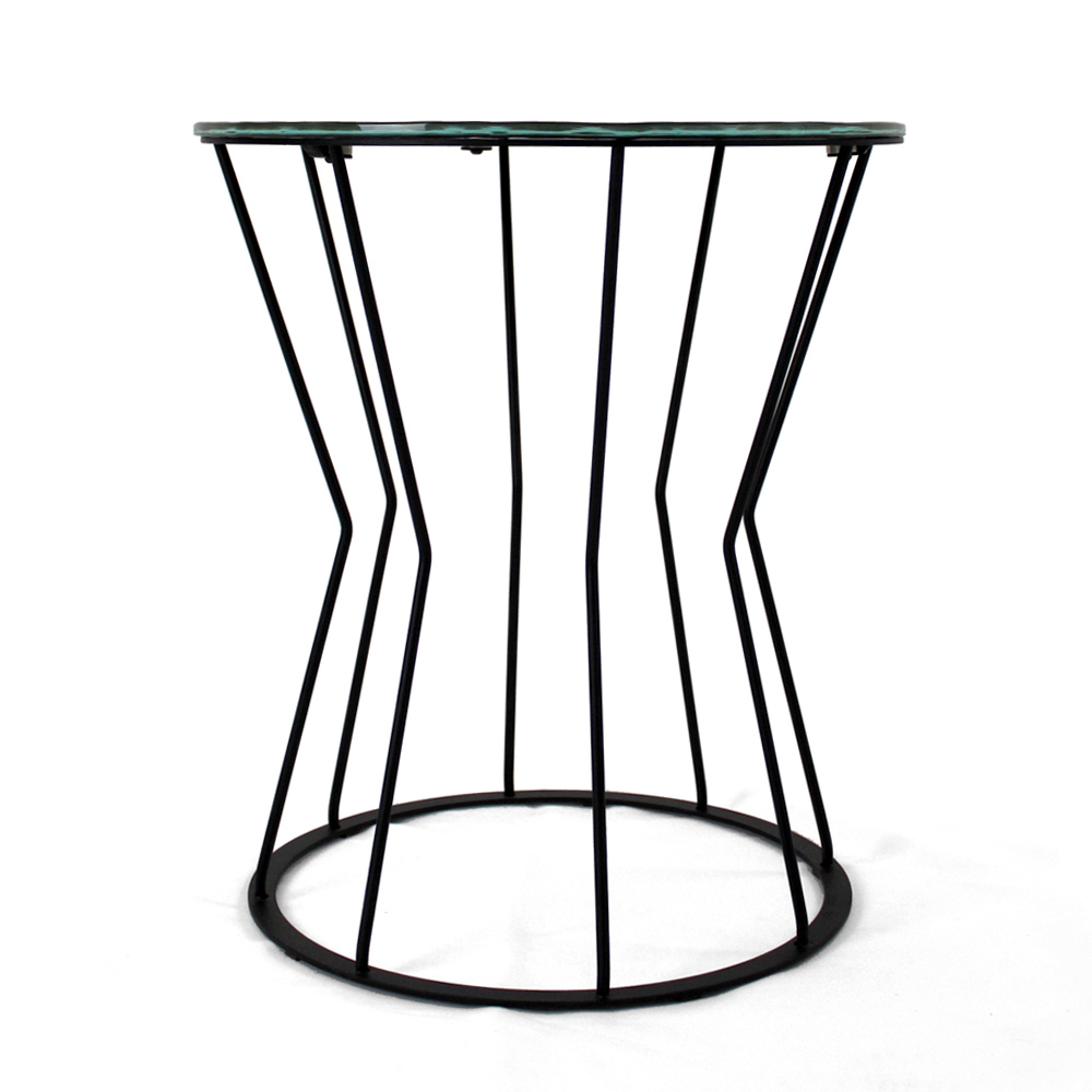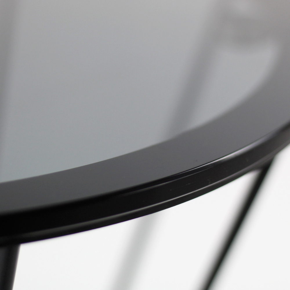 Mesa de centro redonda com base em aço pintado e tampo de vidro.