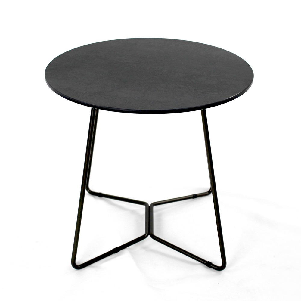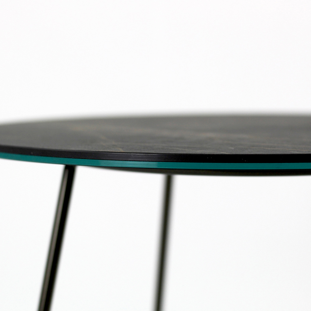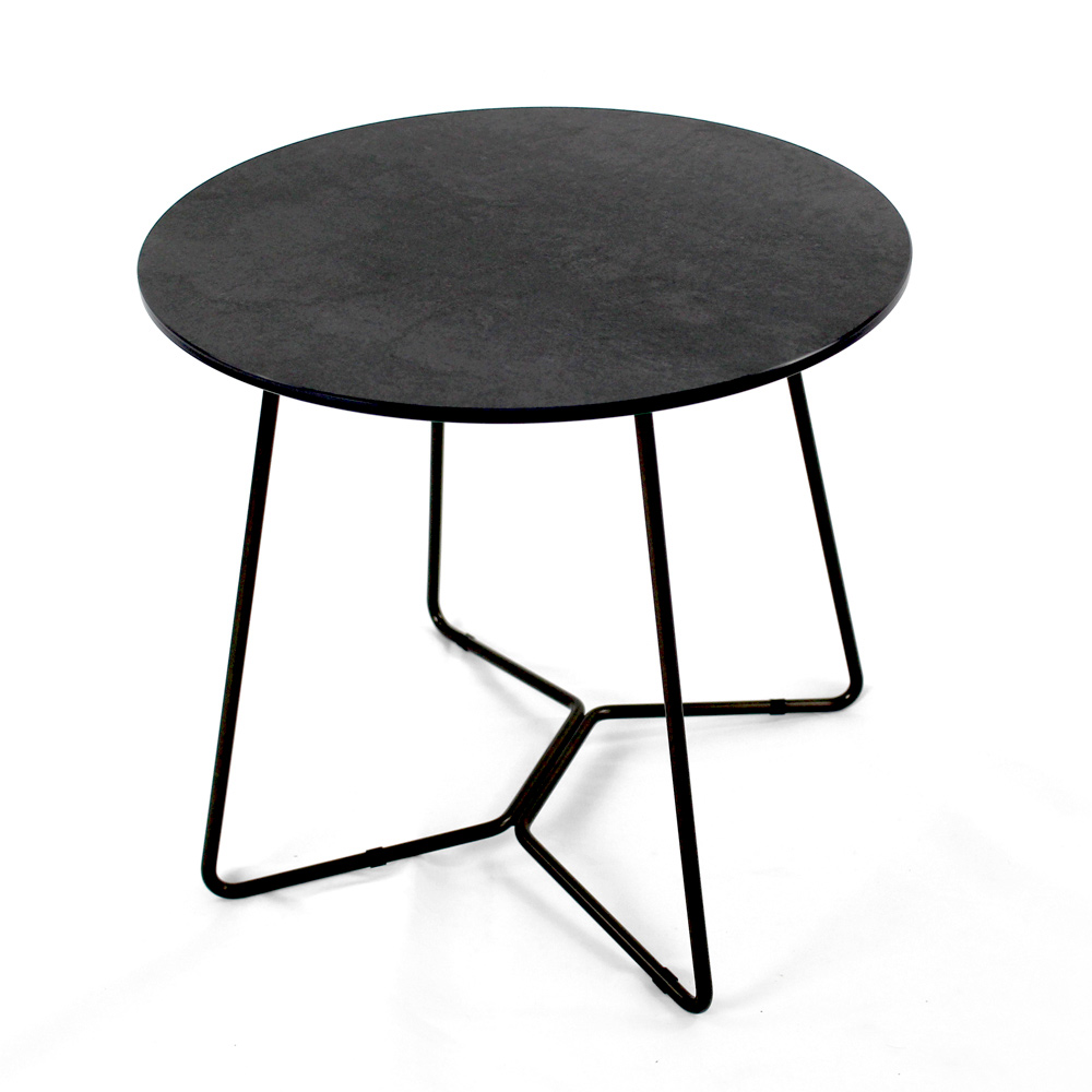 Mesa de centro redonda com base em aço pintado e tampo em grés porcelânico.