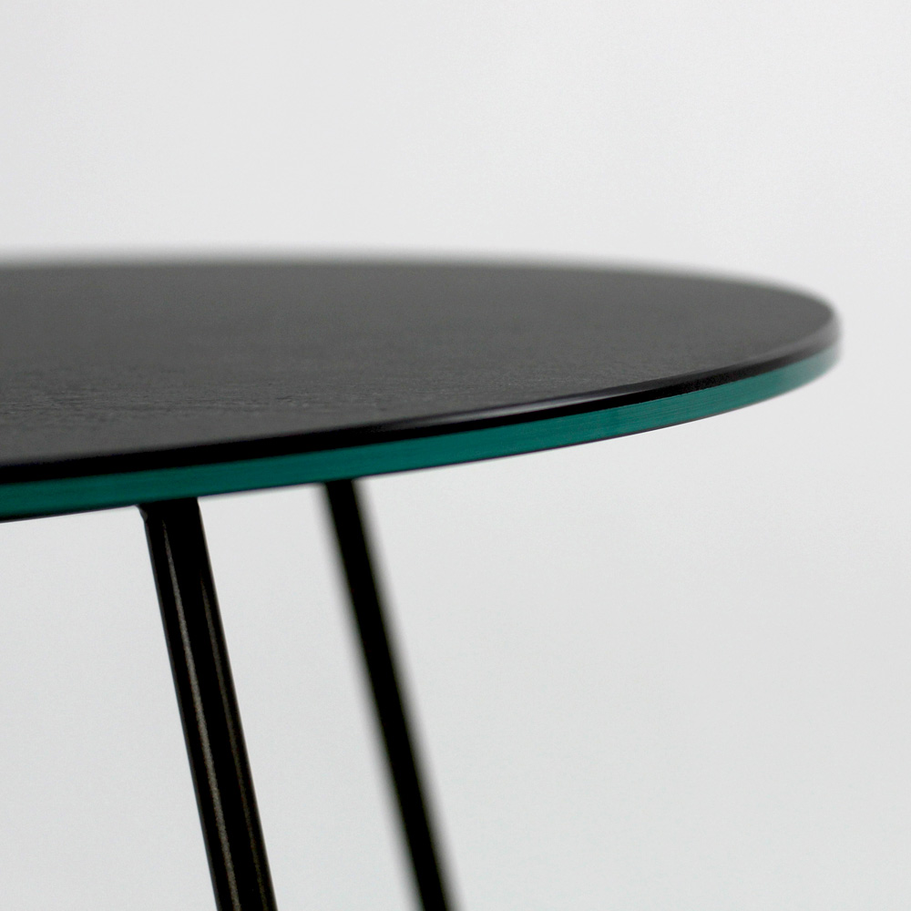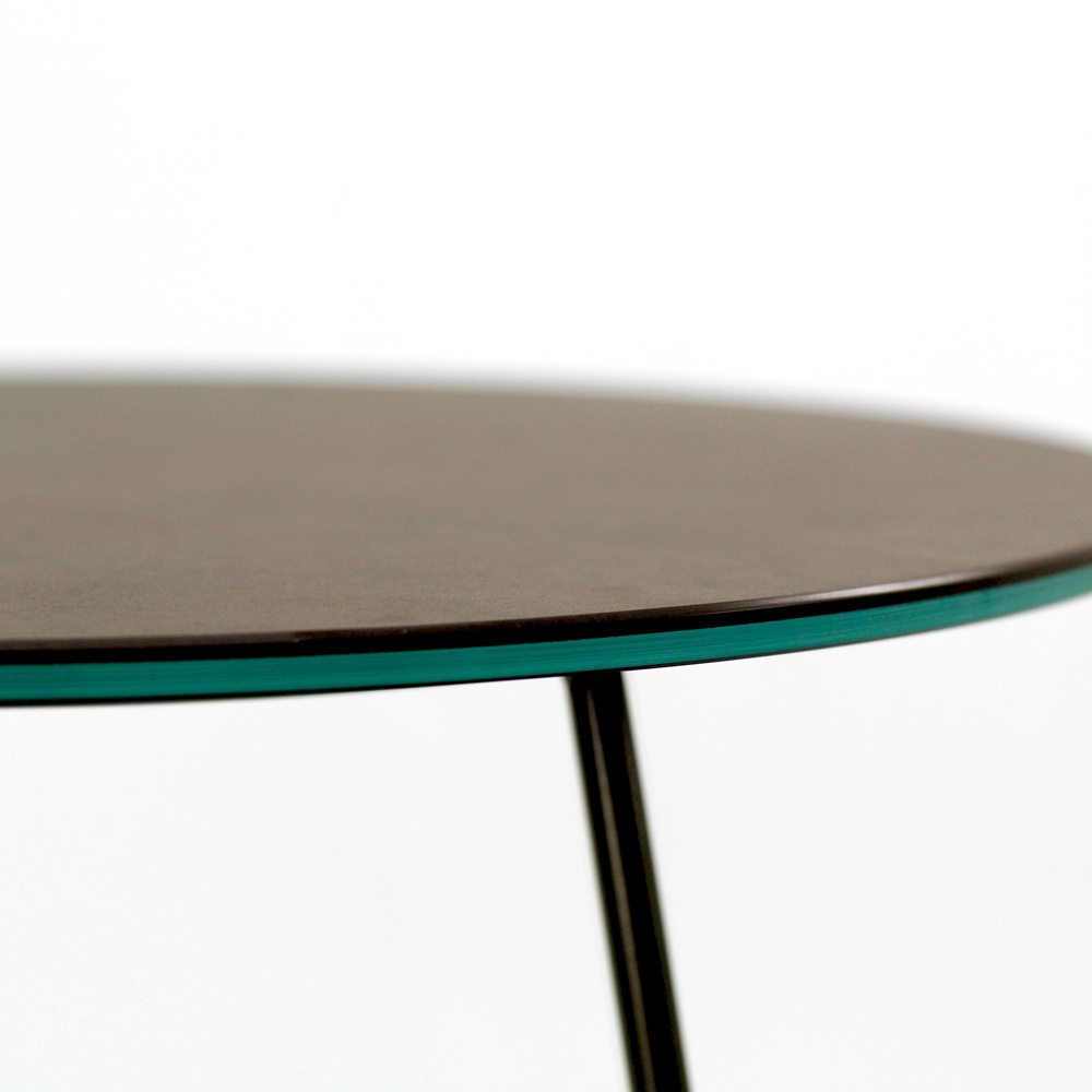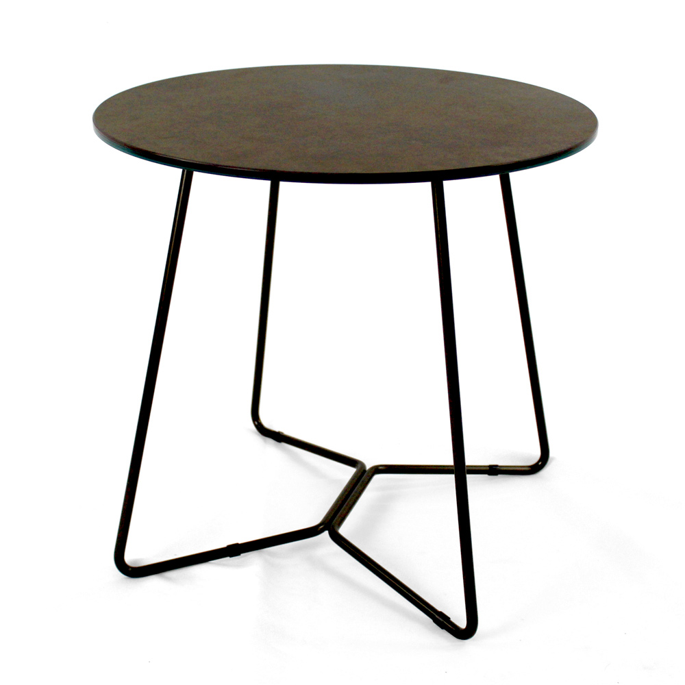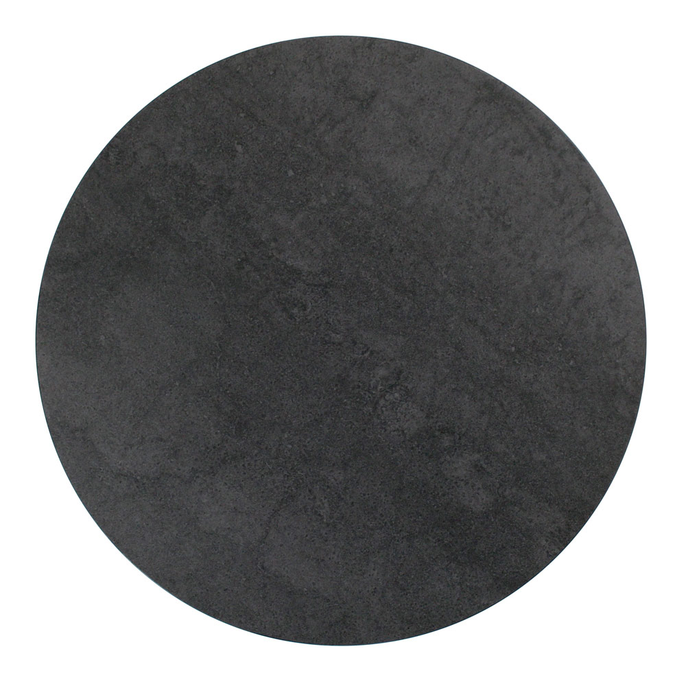 Mesa de centro redonda com base em aço pintado e tampo em grés porcelânico.