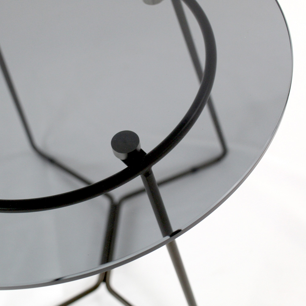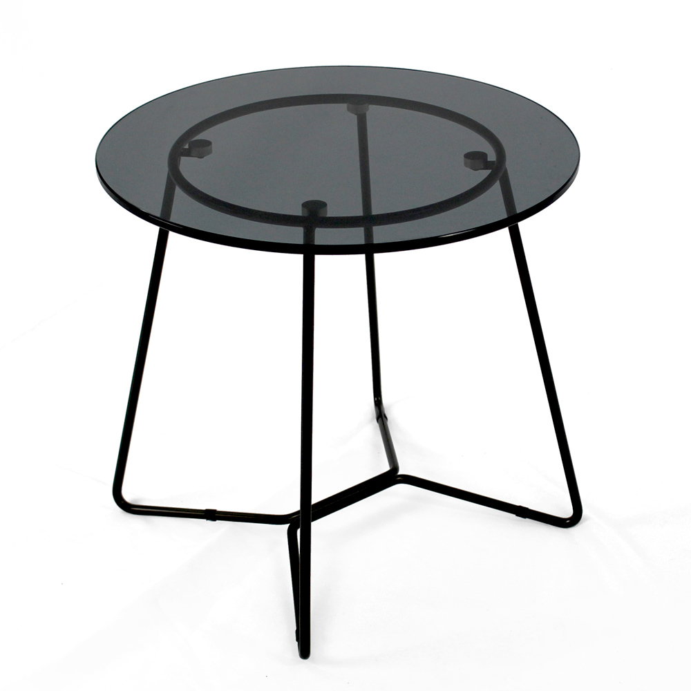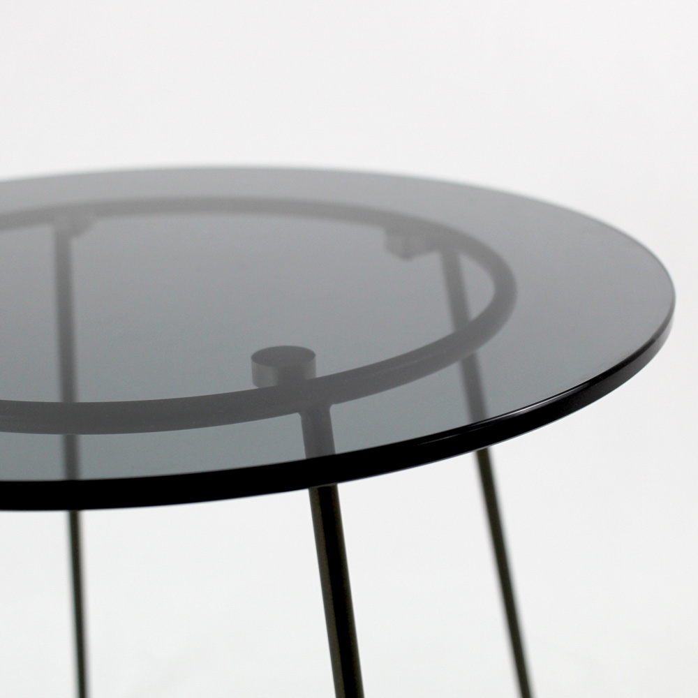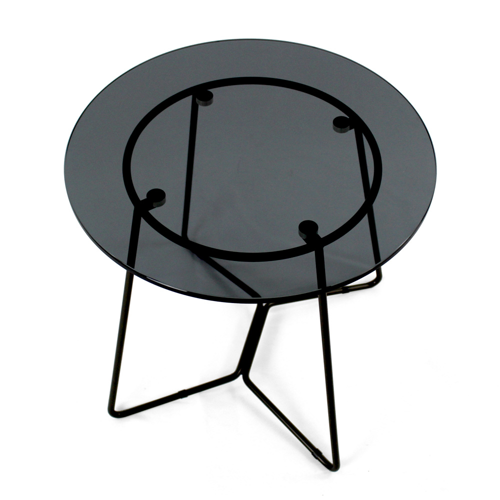 Mesa de centro redonda com base em aço pintado e tampo de vidro.