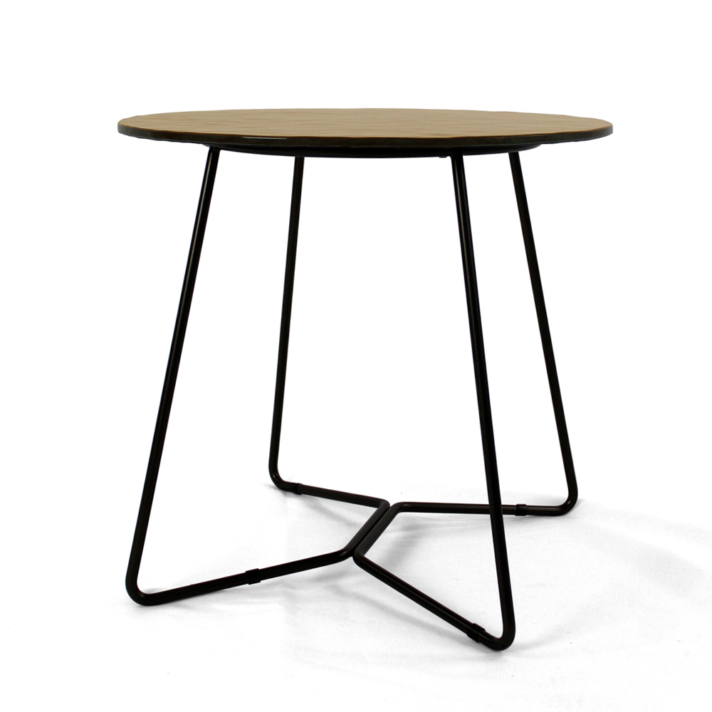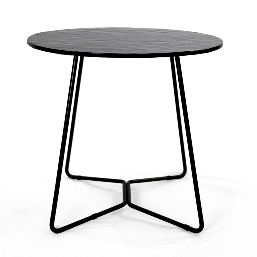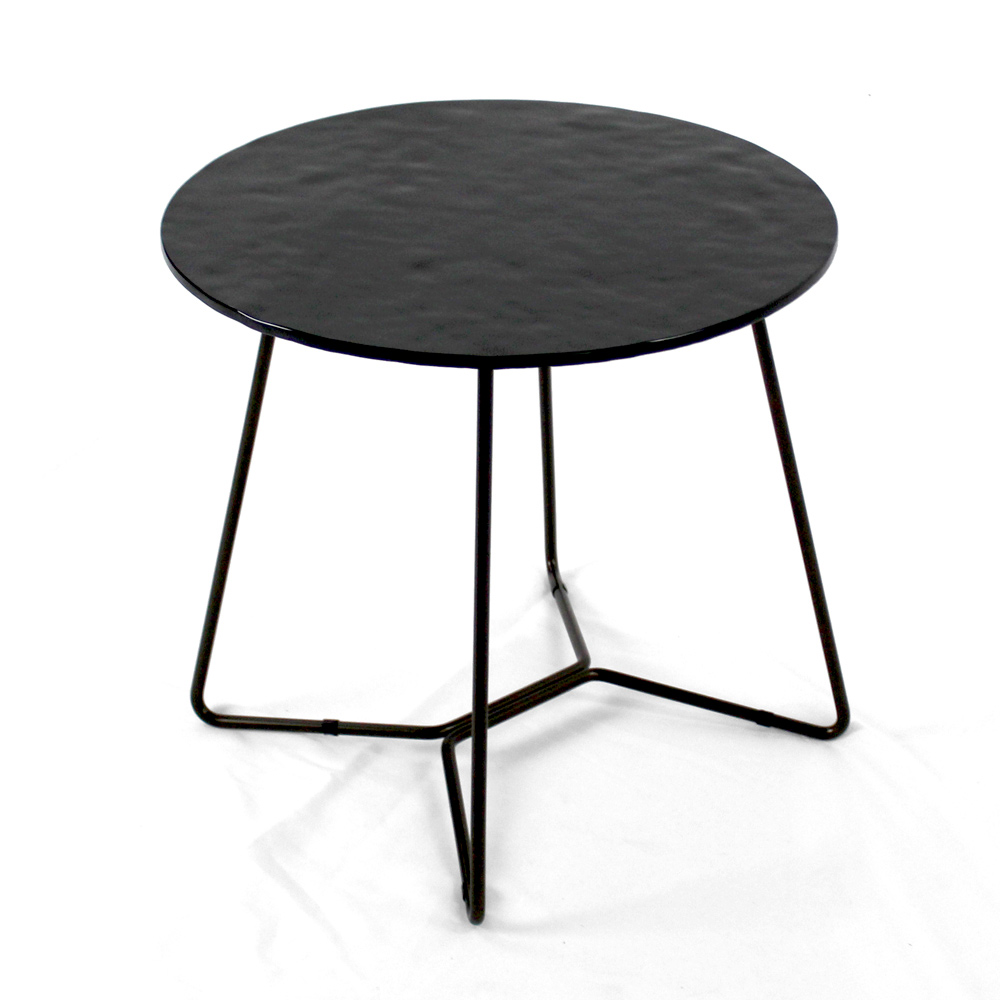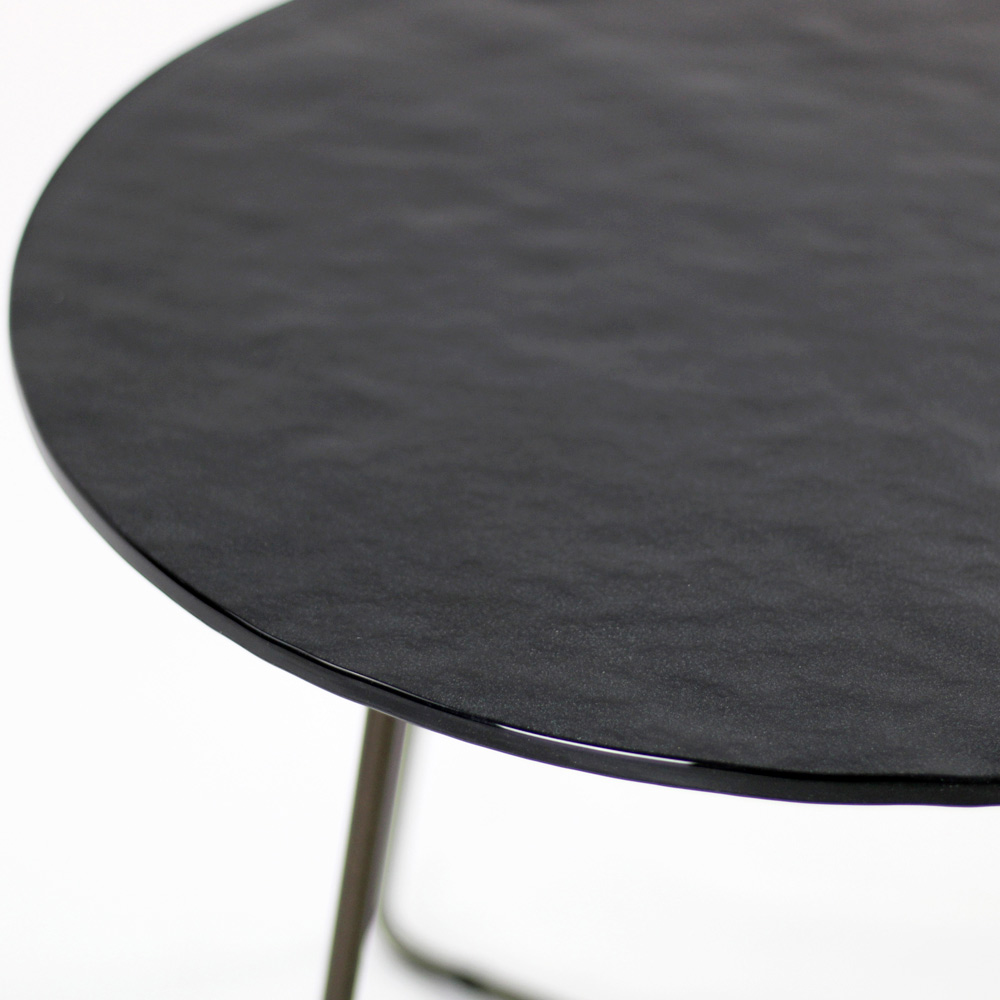 Mesa de centro redonda com base em aço pintado e tampo de vidro.