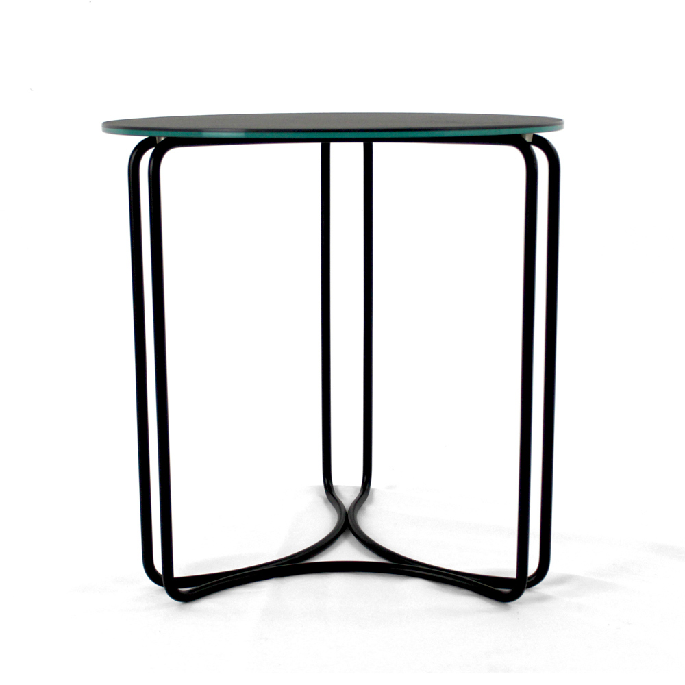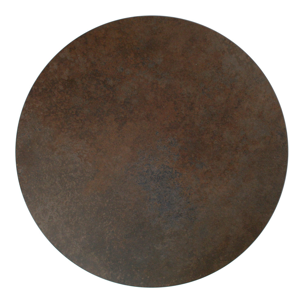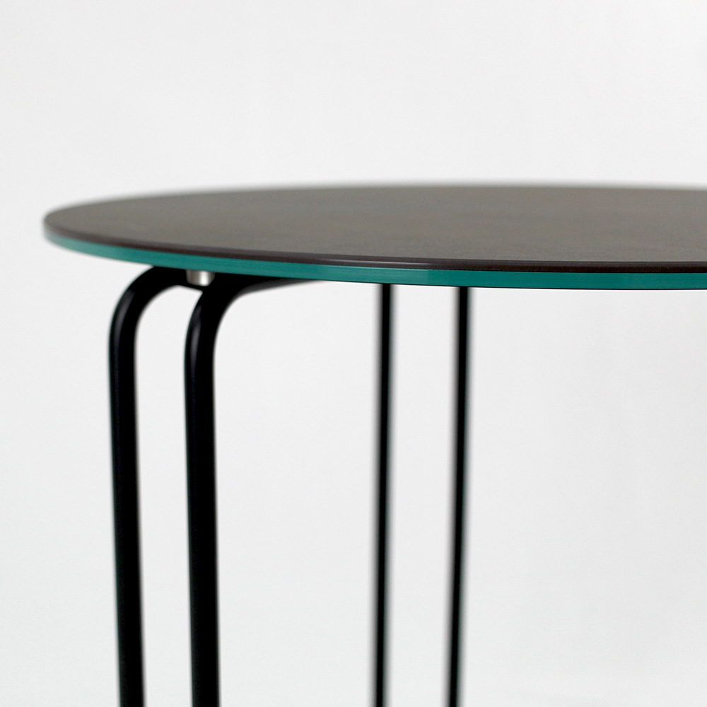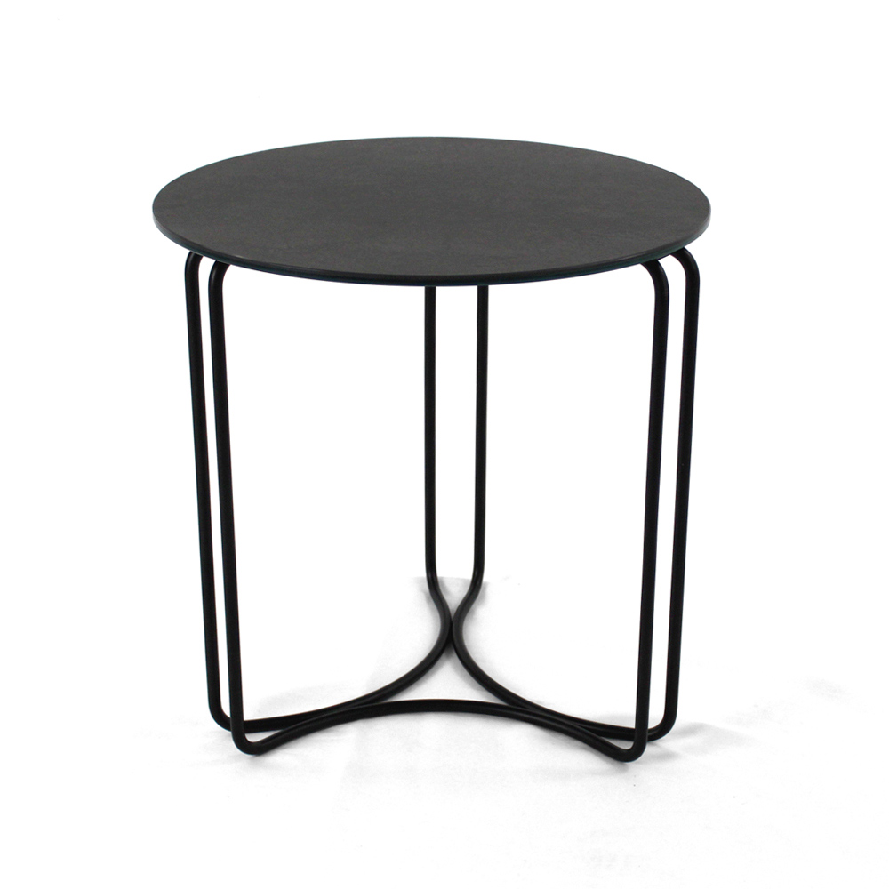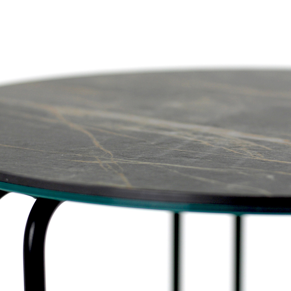 Mesa de centro redonda com base em aço pintado e tampo em grés porcelânico.