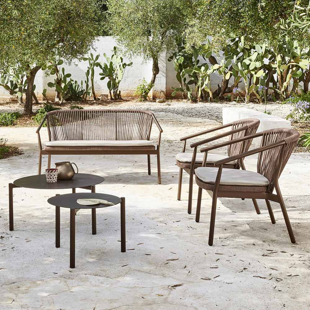 Mesa de centro de jardim composta por tampo e estrutura em alumínio revestido a pó na cor bronze metal. Graças ao seu design linear, limpo e simples, esta mesa de centro é perfeita para decorar qualquer ambiente exterior, como terraços, piscinas e jardins, encontrando também o seu lugar nas várias áreas interiores.