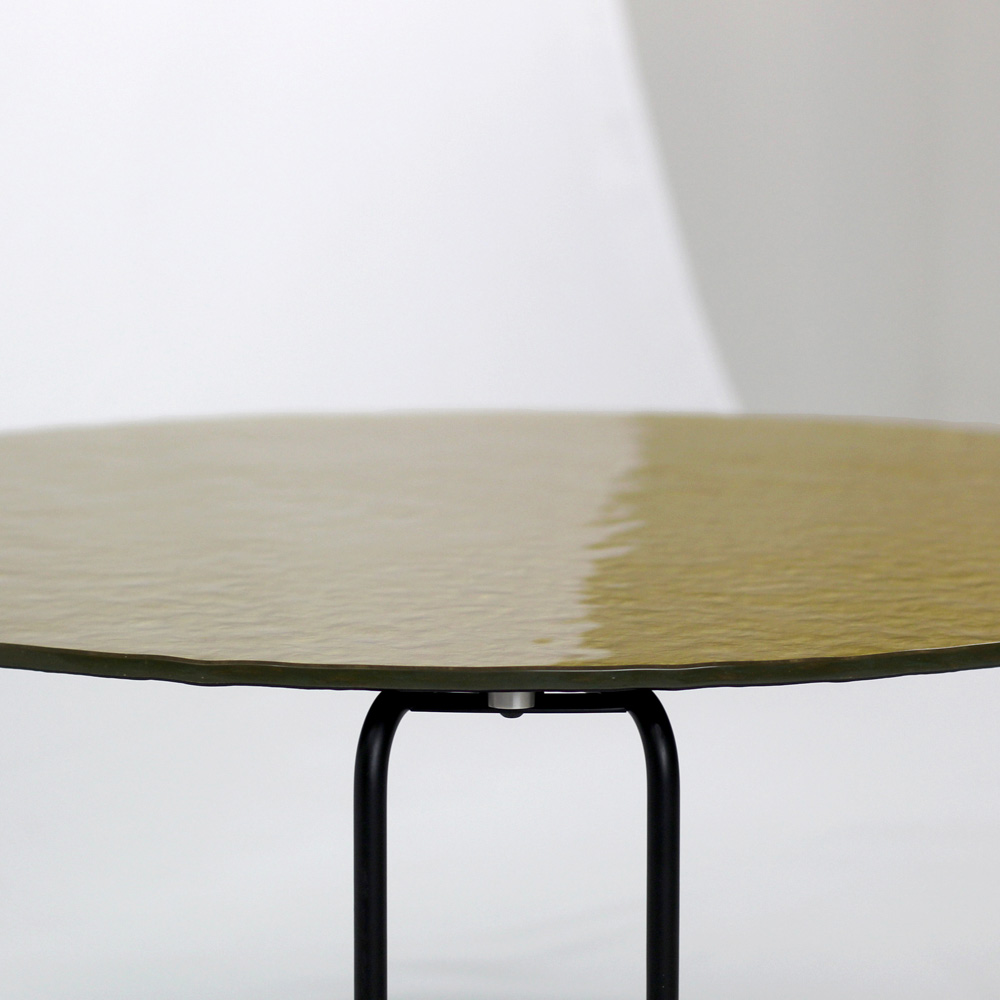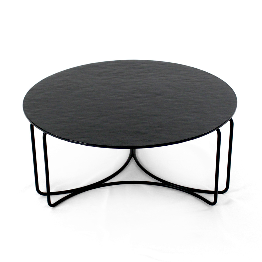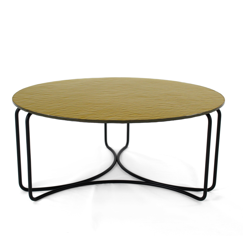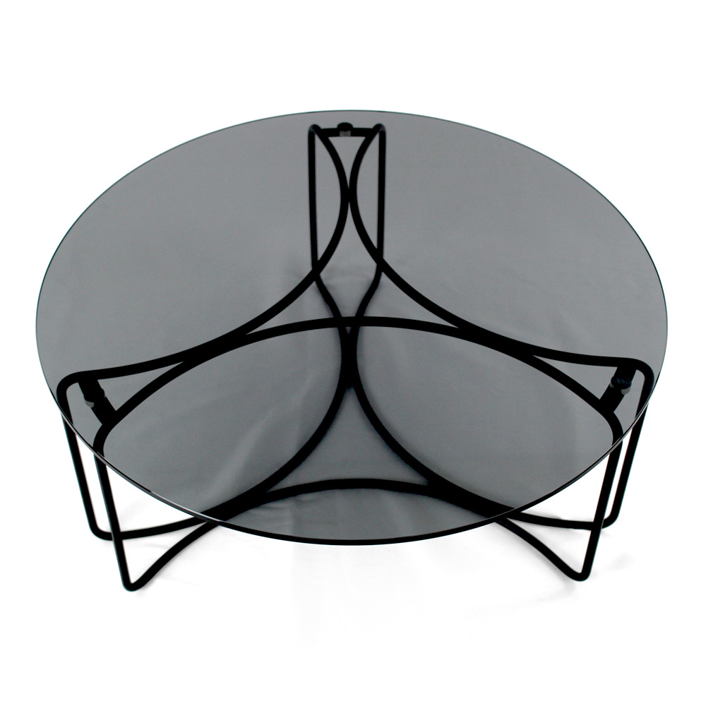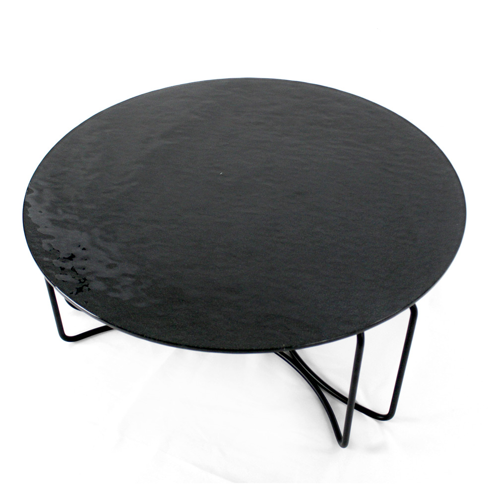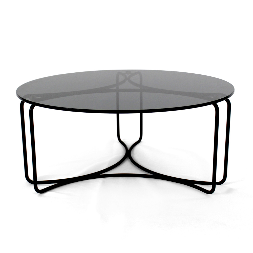 Mesa de centro redonda com base em aço pintado e tampo de vidro.