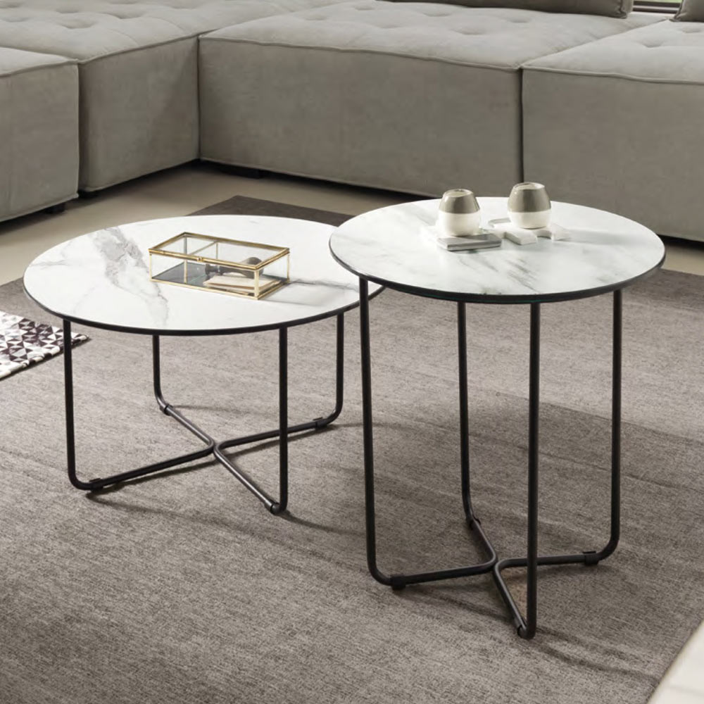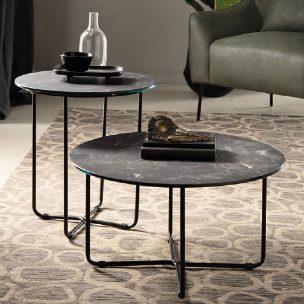 Mesa de centro com tampo redondo de vidro com efeito mármore Fabricado na Itália.