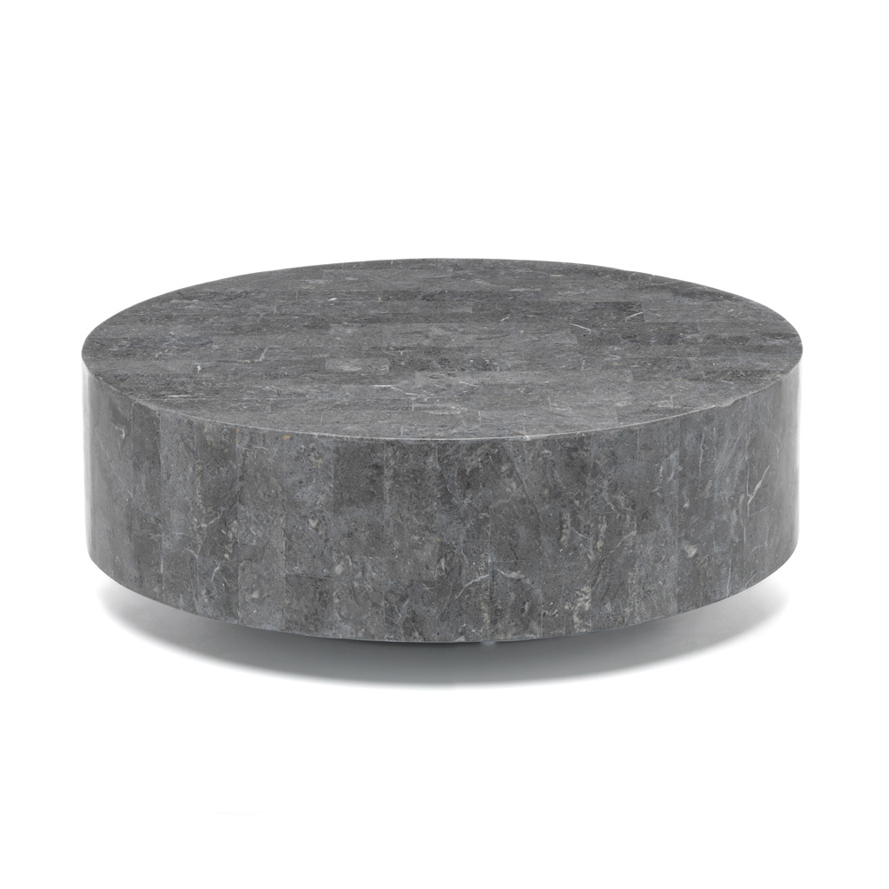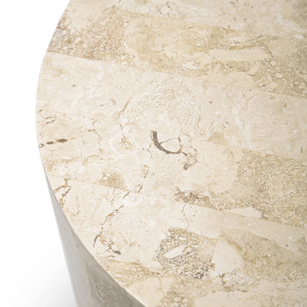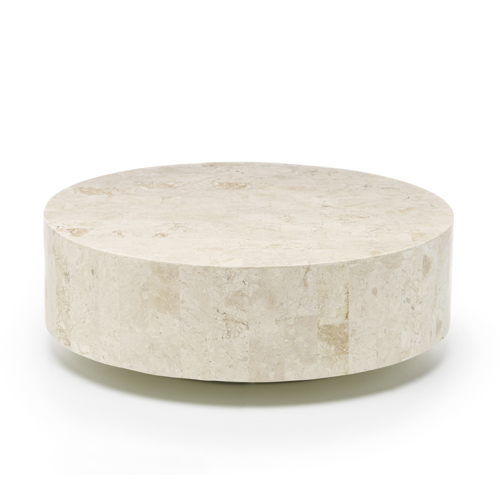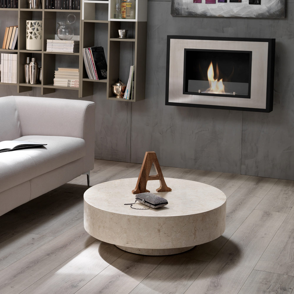 Mesa de centro redonda feita de pedra fóssil.