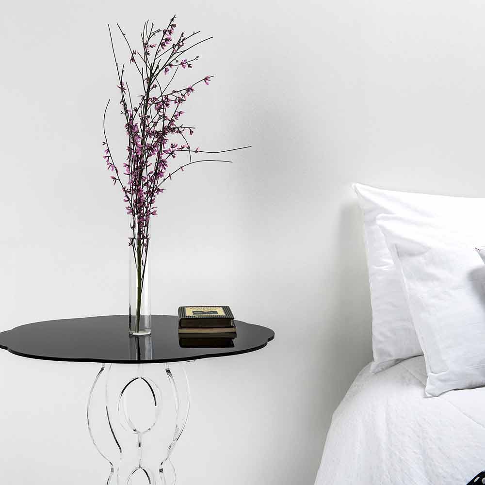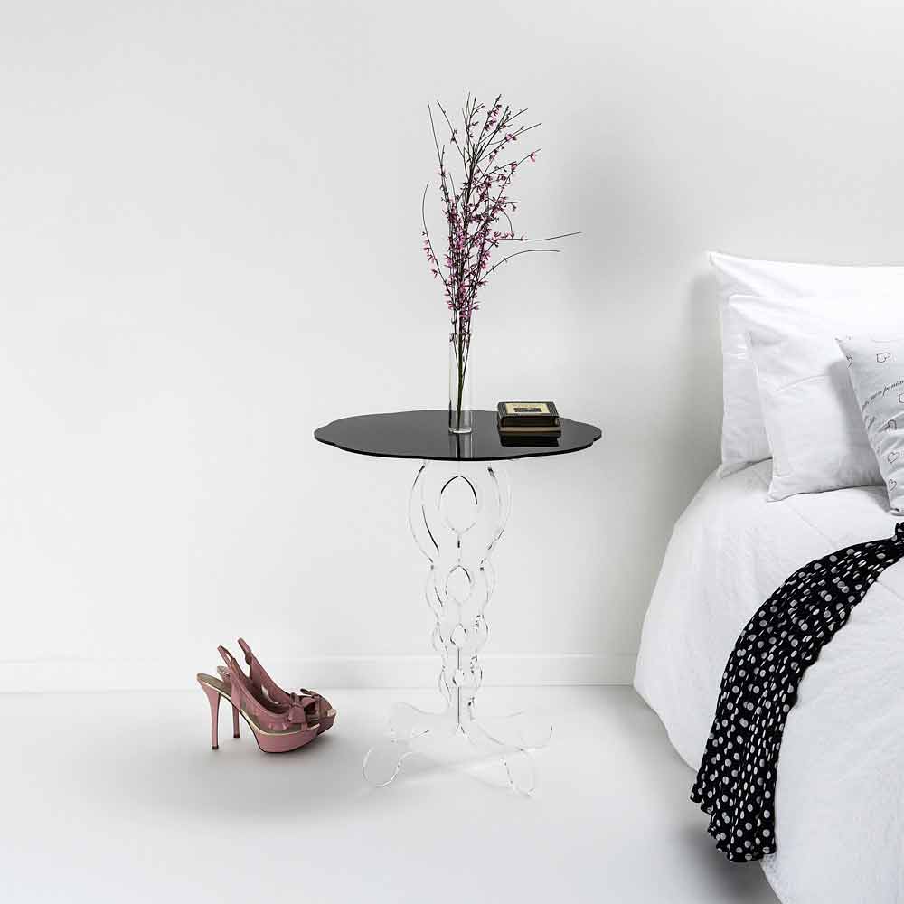 Um projeto mourisco caracteriza a mesa Janis, que pode ser usada tanto como uma mesa de café ou como uma mesa de cabeceira. A base da mesa é feita de plexiglass 100% PMMA em forma de laser. O tampo da mesa dá um toque de cor ao ambiente.