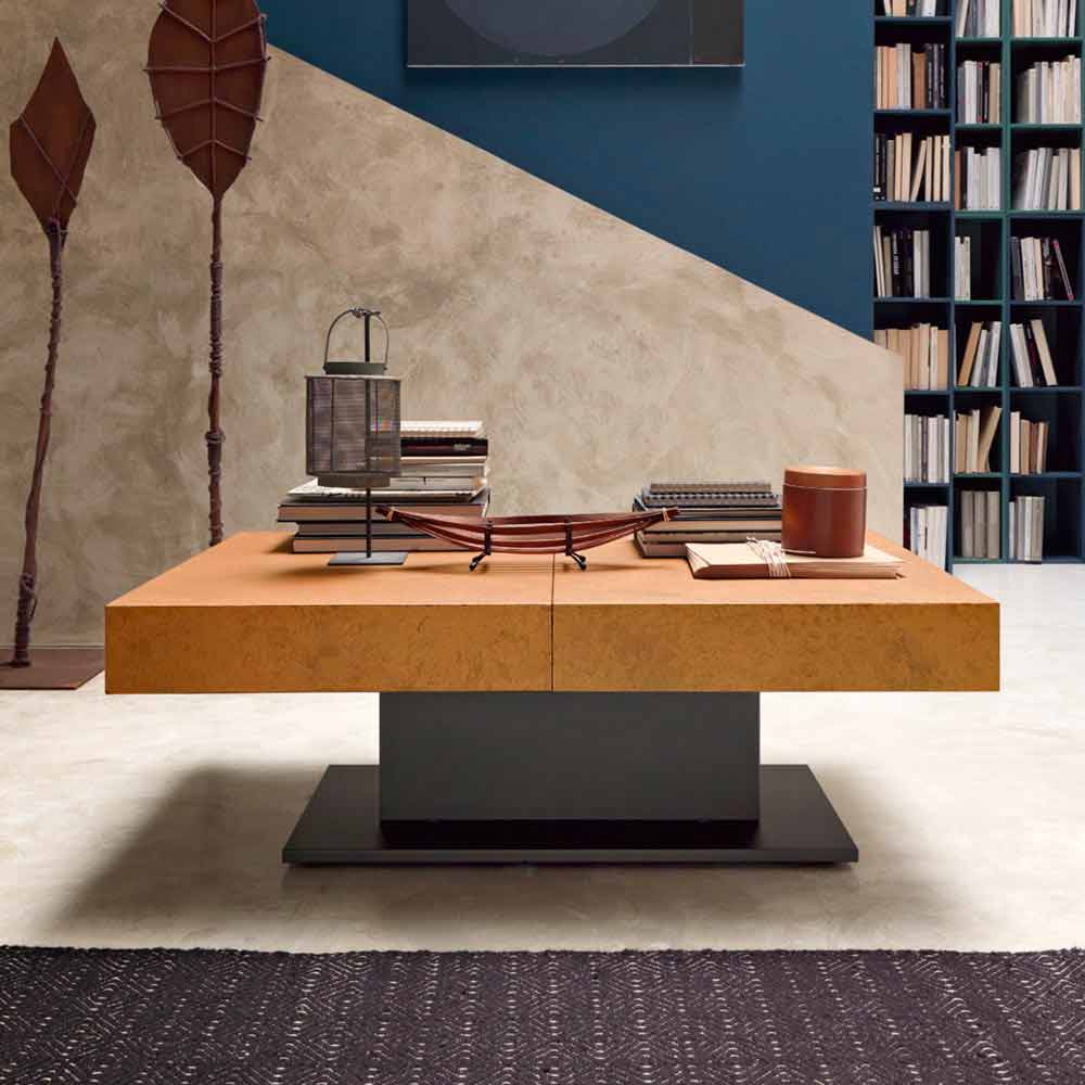 Mesa de centro de design transformável com tampo efeito argamassa e base de aço Made in Italy.
