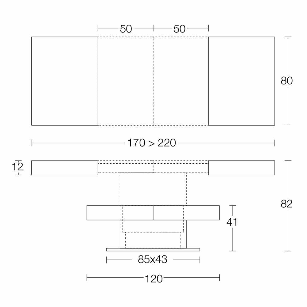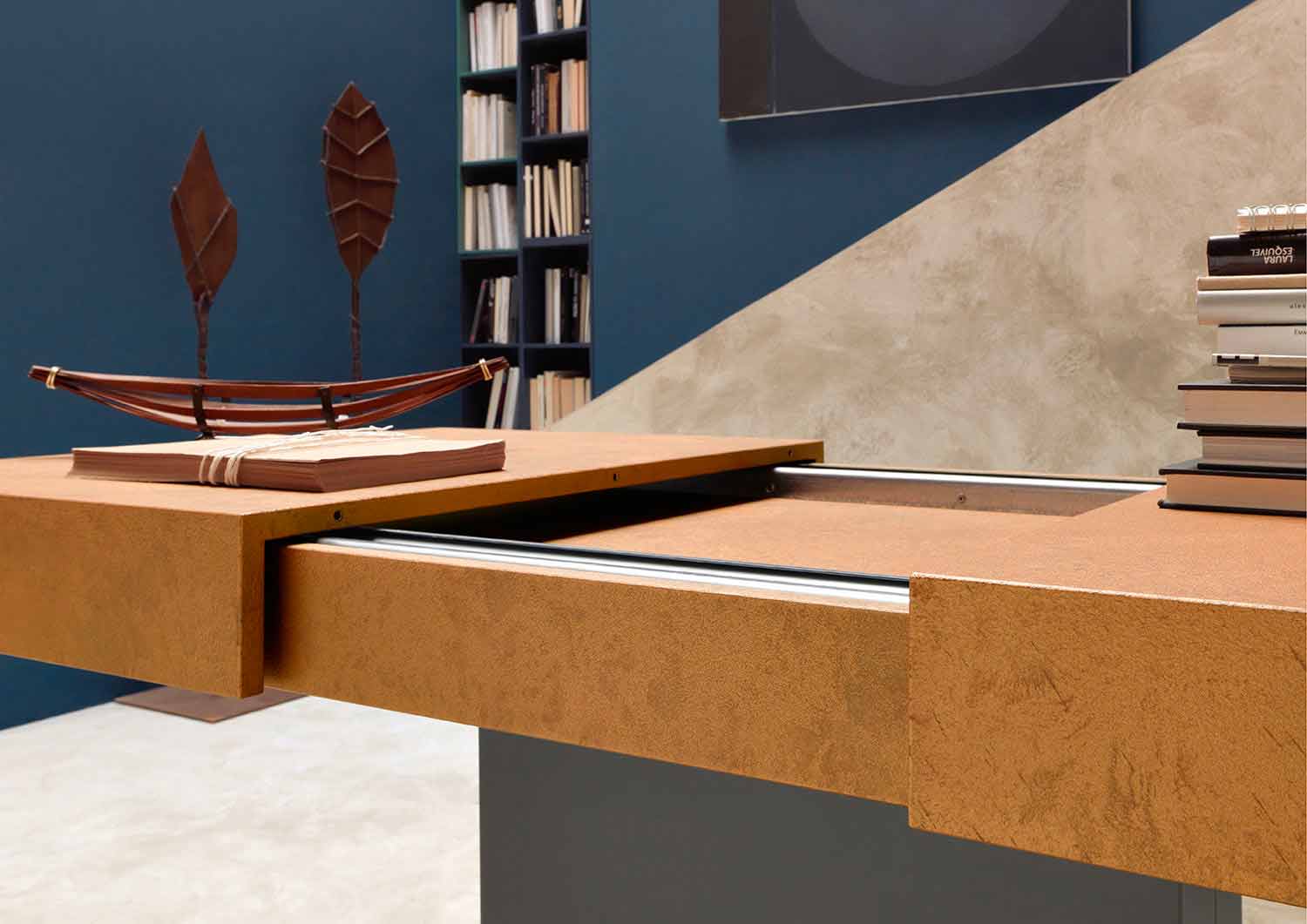 O tampo é retangular e extensível através de duas extensões (internas) de 50cm cada e é capaz de se transformar em mesa de jantar graças ao mecanismo a gás que ajusta a altura ao milímetro: de 41cm a 82cm.